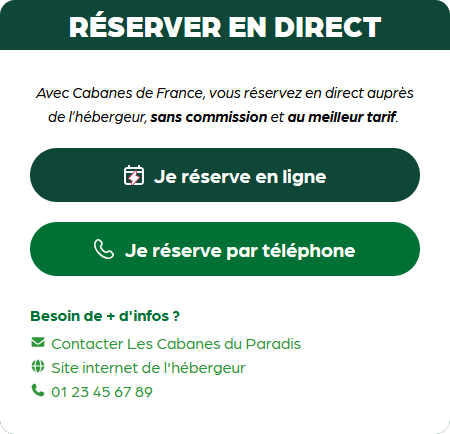 Et si vous êtes en possession d’une carte cadeau Cabanes de France ? Il n’est pas toujours possible de réserver sur le site internet de l’hébergeur avec une carte cadeau. C’est pourquoi nous vous invitons à réserver par téléphone ou faire une demande via le formulaire de contact. L’hébergeur pourra ainsi vous indiquer la procédure pour le règlement par carte cadeau.