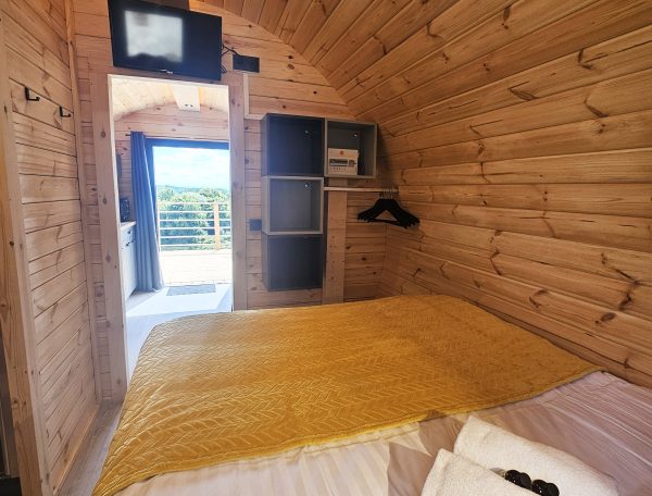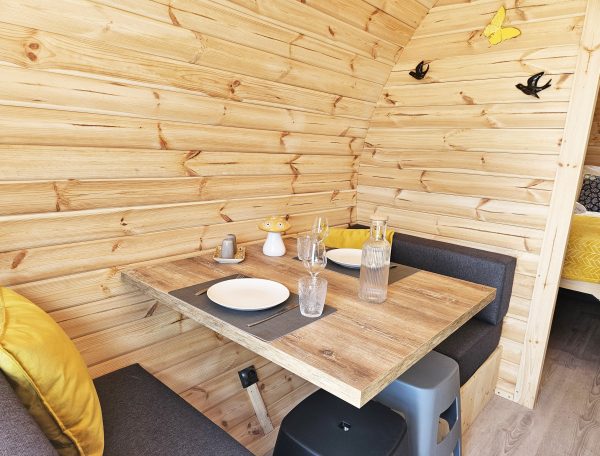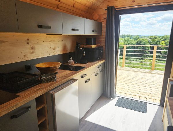 À l’intérieur, l’espace est pensé avec soin : un coin nuit chaleureux doté d’un lit douillet vous promet des nuits paisibles, tandis qu’une kitchenette parfaitement équipée (réfrigérateur, plaques de cuisson, machine à café….) facilite vos repas et vos moments de détente.