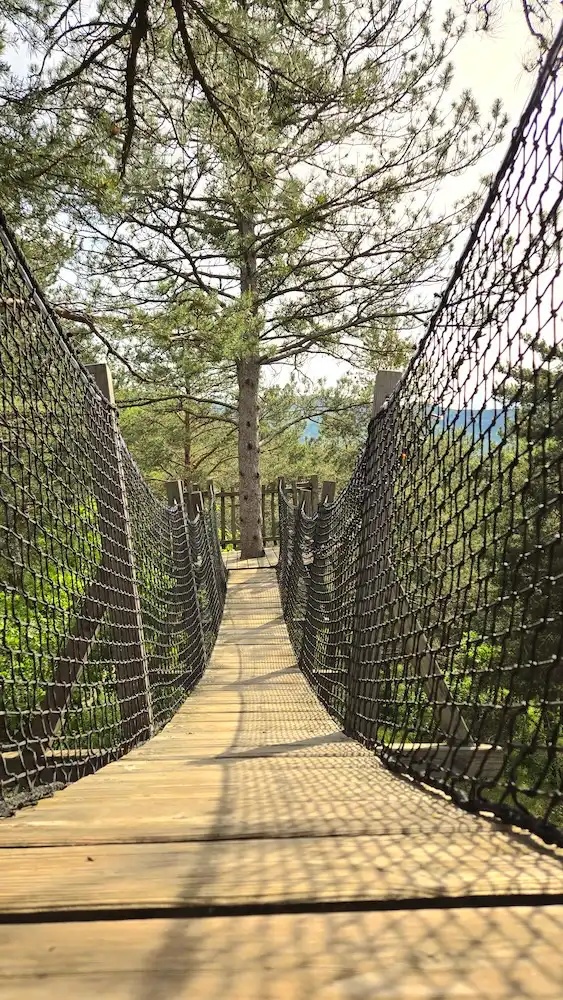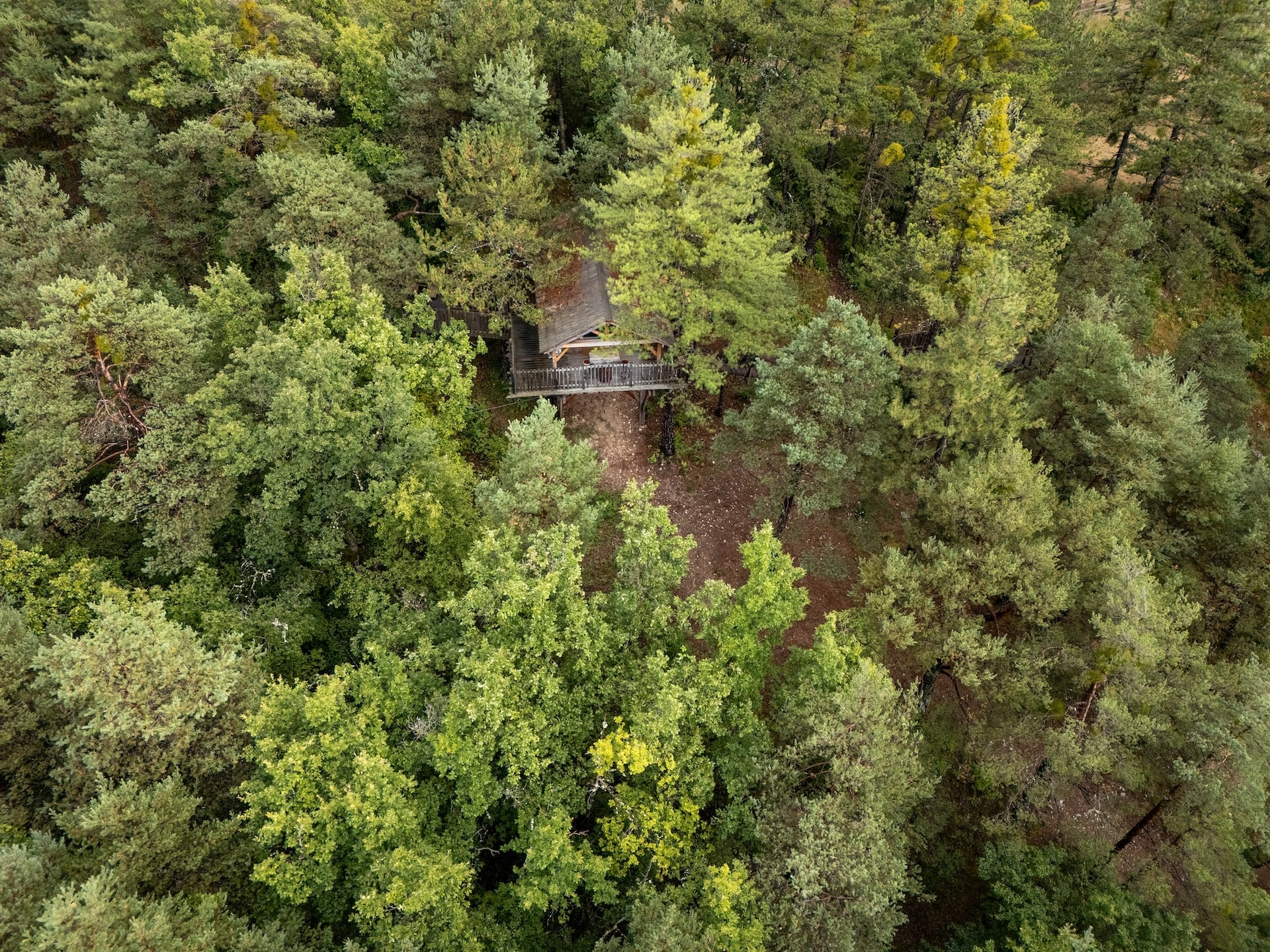 Perchée à flanc de colline, la cabane Bois d’Arambre, est une parenthèse suspendue entre ciel et nature. Accessible par un escalier suivi d’un pont suspendu à 8 mètres de hauteur, elle vous invite à prendre de la hauteur et à vous évader loin de l’agitation.