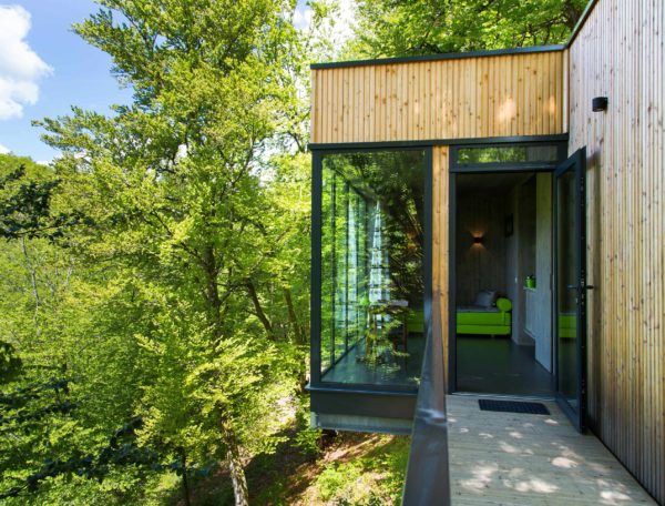 Hébergement insolite en Limousin : cabane moderne avec vue sur la nature verdoyante.