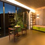 Hébergement insolite à Limousin : intérieur moderne avec vue sur la forêt et mobilier coloré.