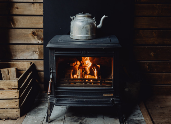 Chalet en bois avec poêle à bois et bouilloire, ambiance chaleureuse et cosy.