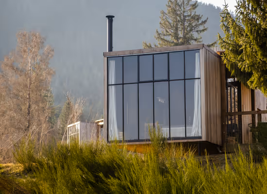 Cabane moderne en bois avec grandes baies vitrées, entourée de verdure à Champagne-Ardennes.