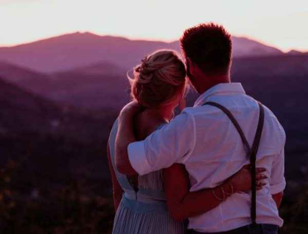Couple admirant le coucher de soleil depuis un hébergement insolite en Auvergne-Rhône-Alpes.