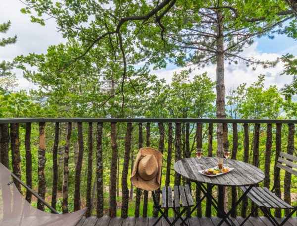Tente glamping sur plateforme en bois, entourée de pins en Auvergne-Rhône-Alpes.