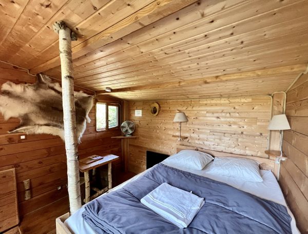 Cabane perchée pour 2 personnes, tel un mirador, vous aurez une vue magique sur le parc des Cerfs aussi bien depuis la balançoire, la terrasse, que depuis votre lit. Nouveauté 2023 : Bel agrandissement de la superficie avec une nouvelle terrasse sur pilotis au cœur du parc et son espace détente original : un filet hamac. L’un de ses atouts fort est la décoration qui vous garantira un dépaysement total.