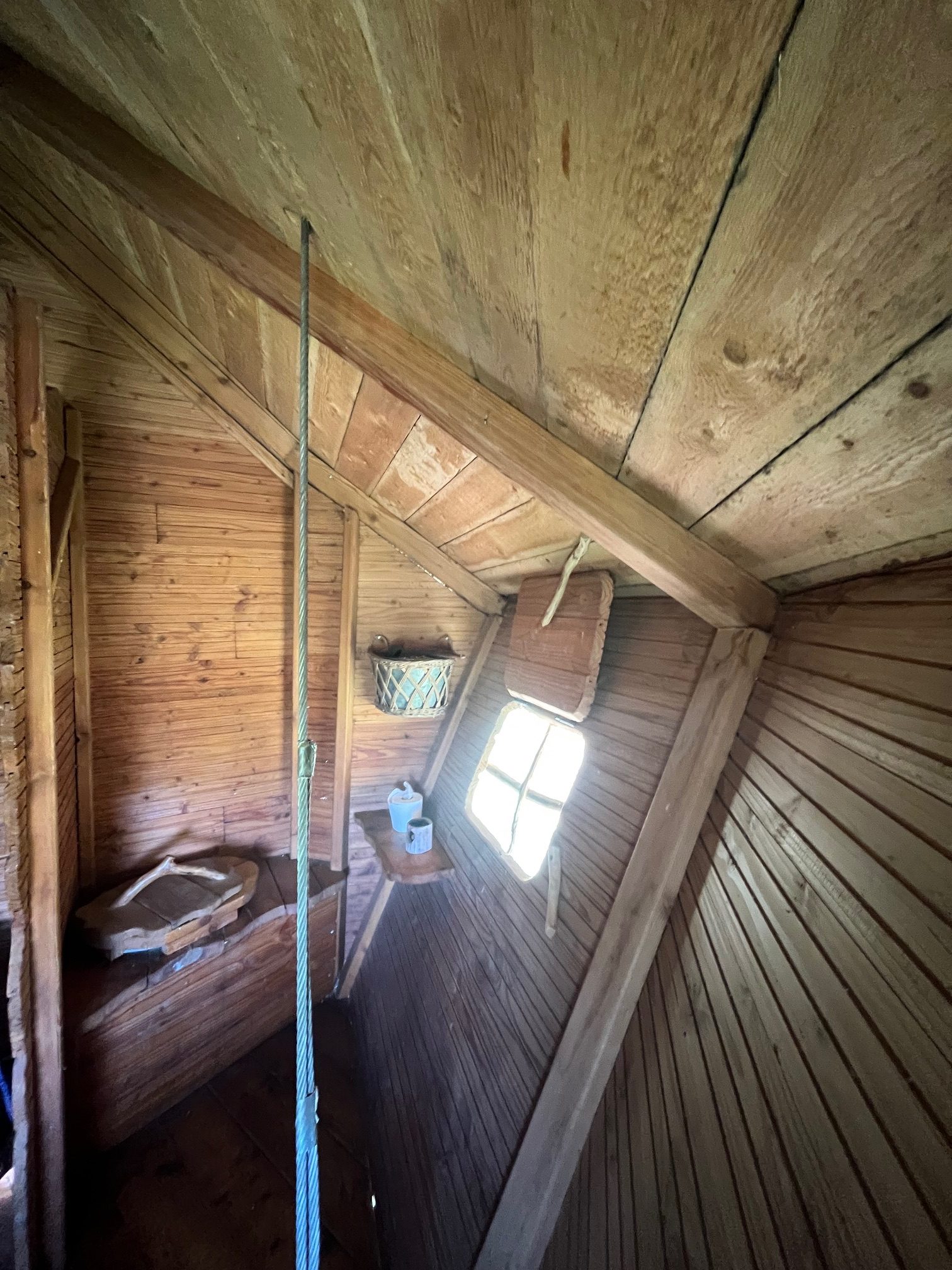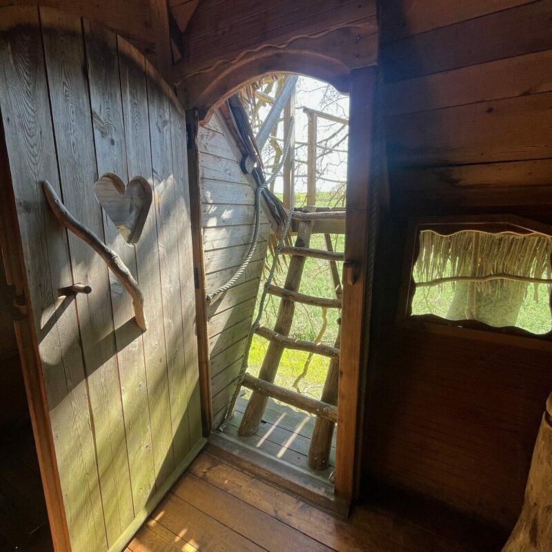 Elle est assez atypique, son accès se fait par une échelle de meunier sécurisé par un filet avec une trappe donnant directement dans la cabane.