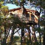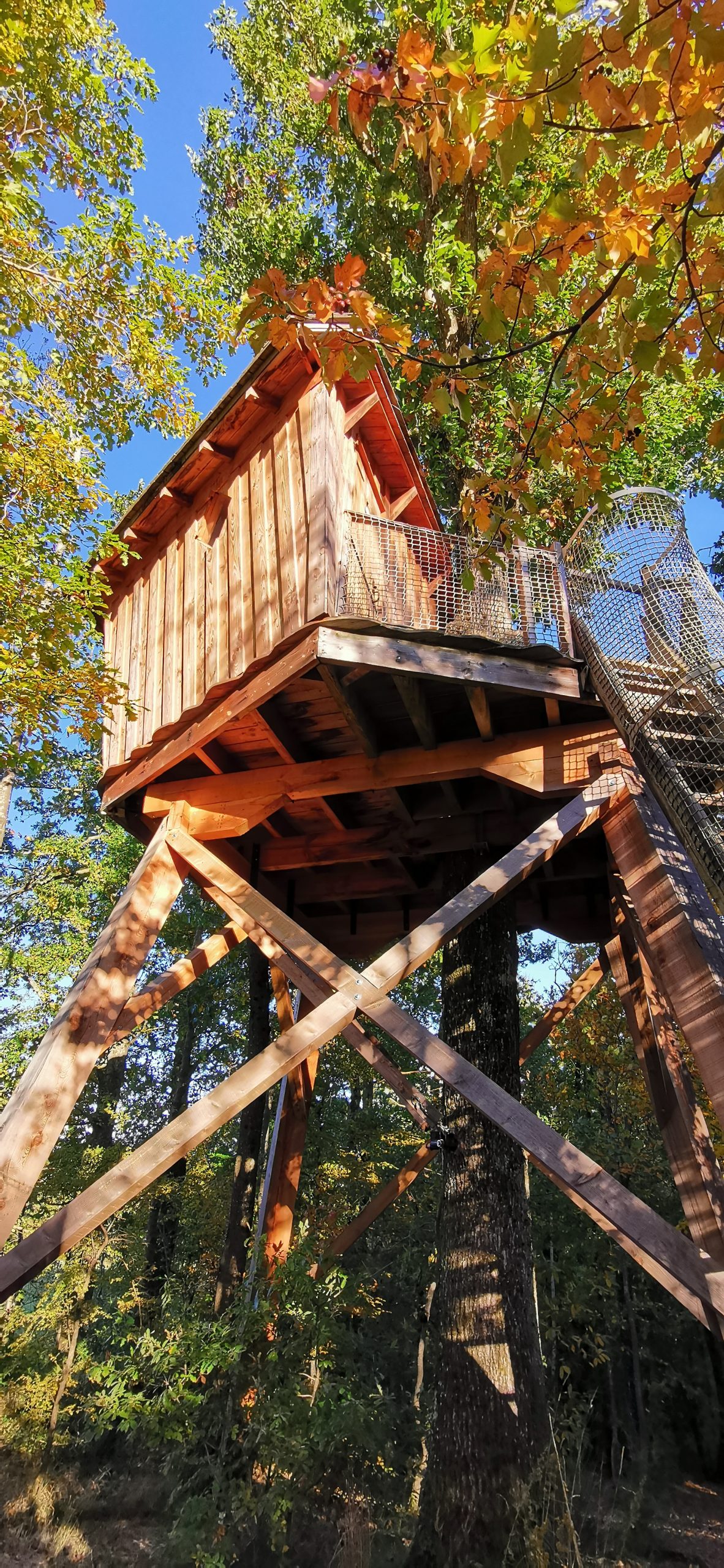 L’accès est assuré par une échelle à crinoline. La terrasse est sécurisée par un filet de protection. Cabane équipée d’un lit double 140×190 et d’un lit simple 90 x190, *couette et oreillers, table et chaises, d’éclairage solaire et de photophores, d’un extincteur, d’un détecteur de fumée et de toilettes sèches. Sans eau ni électricité.