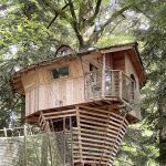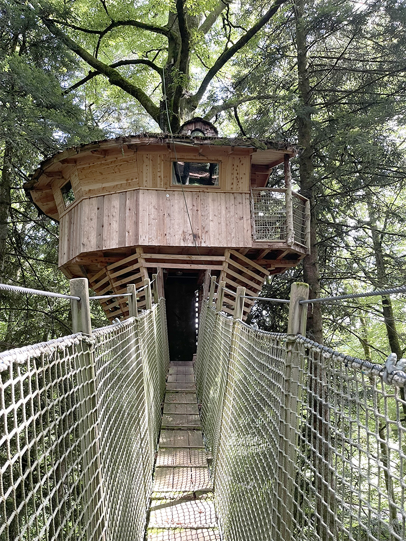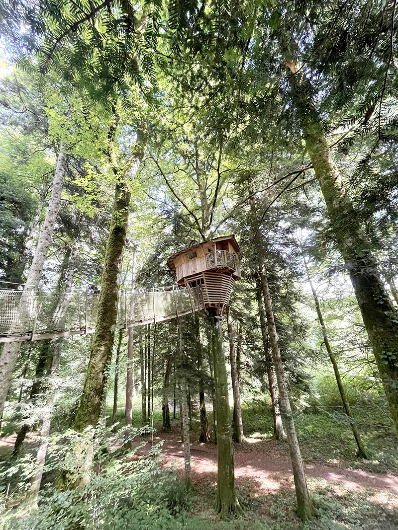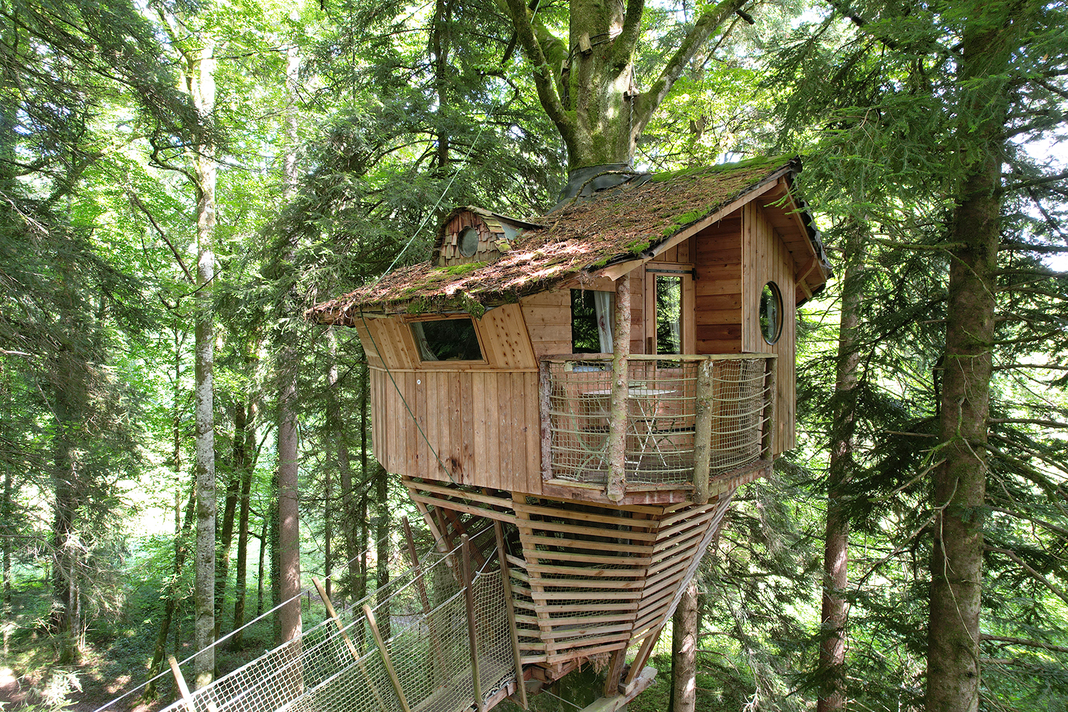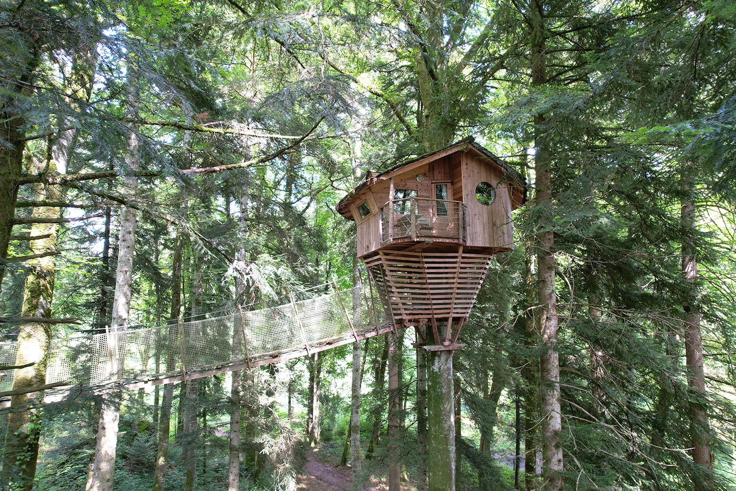 Cabane  la plus haute de France viabilisée (15 -18m, aménagée en gîte tout confort : salle de bains, lavabo, douche, wc, eau froide/eau chaude, cuisinette tout équipée, isolation et chauffage électrique), perchée sur un hêtre de 40m de haut, accessible par escalier et passerelle. Interdite aux moins de 16 ans.