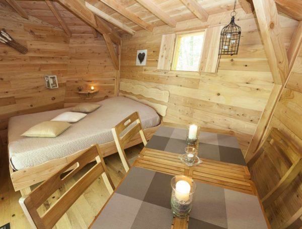 L’accès est assuré par un escalier. La terrasse est sécurisée par un filet de protection. Cabanes équipées de lits double 140×190,* couettes et oreillers, table et chaises, d’éclairage solaire et de photophores, d’un extincteur, d’un détecteur de fumée et de toilettes sèches. Sans eau ni électricité. Le petit déjeuner est compris dans le prix du séjour et un panier terroir est disponible sur commande, apportés tous deux au pied de la cabane.