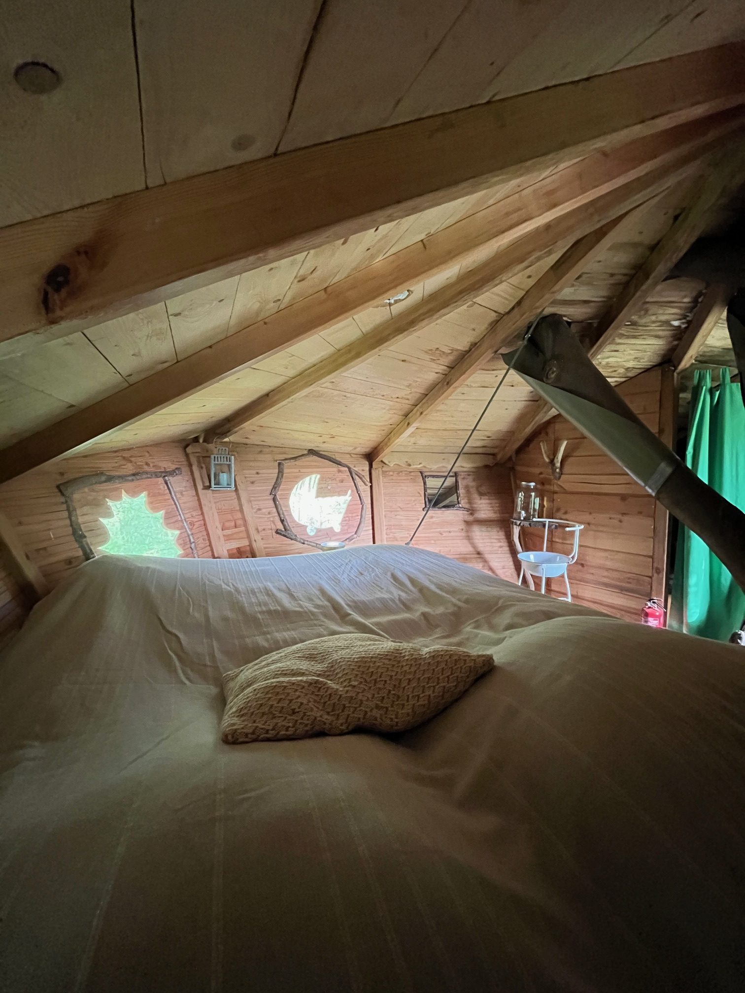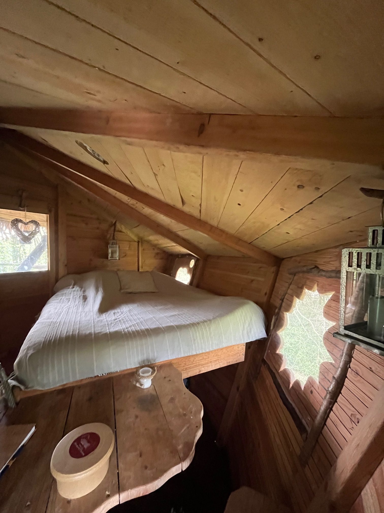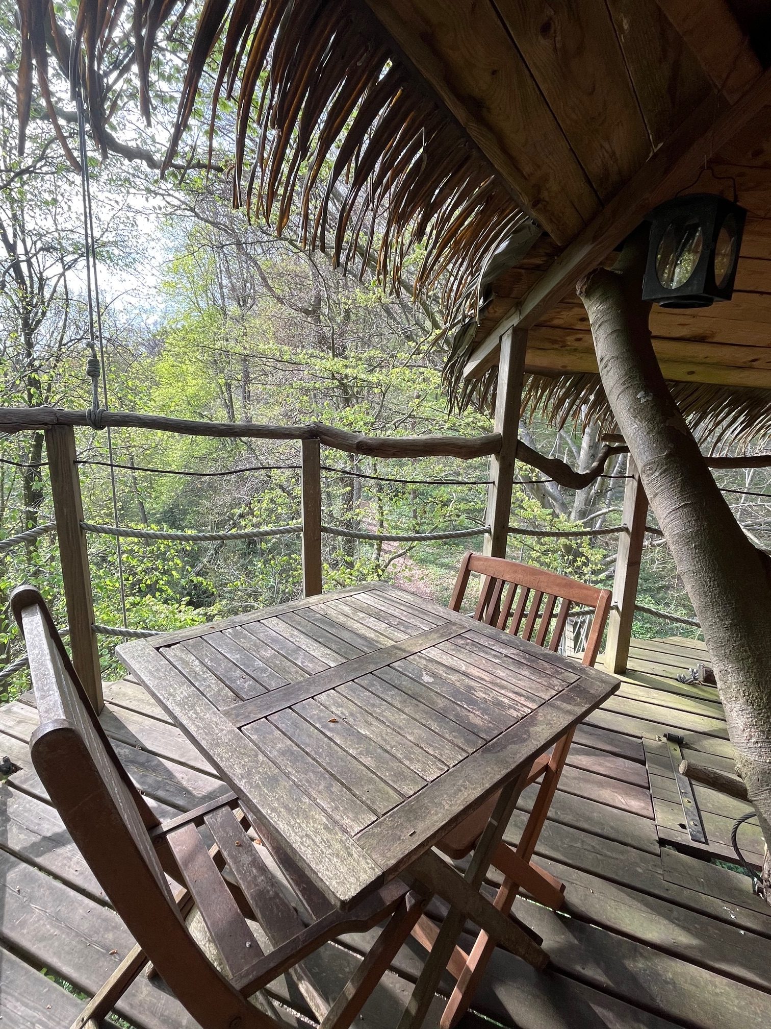Depuis la terrasse, on ne distingue plus le sol 12mètres plus bas. Cette cabane vous garantit une expérience unique à deux, bercé dans le houppier du hêtre qui vous héberge. Il est conseillé d’arrivée de jour pour découvrir l’accès.