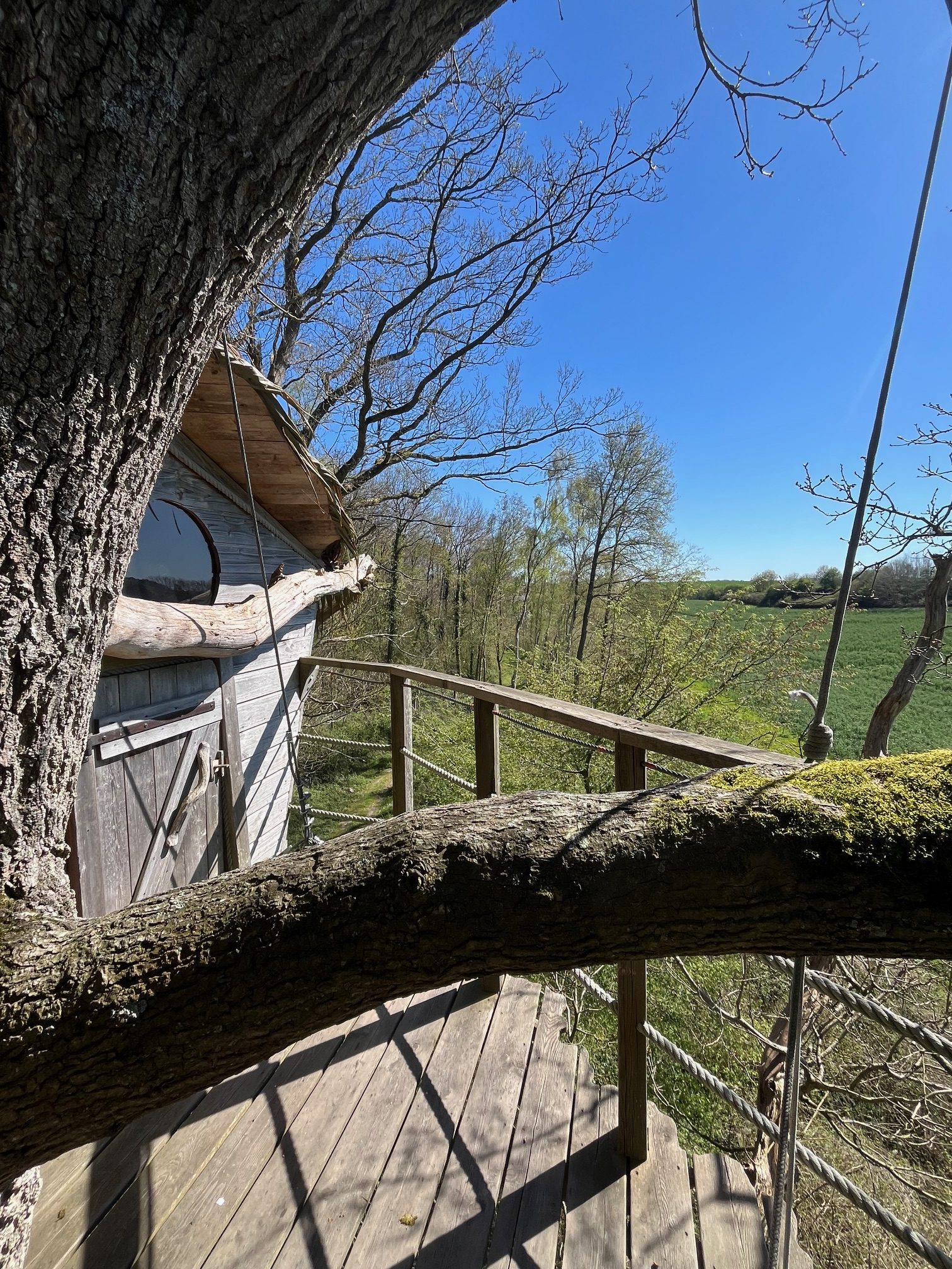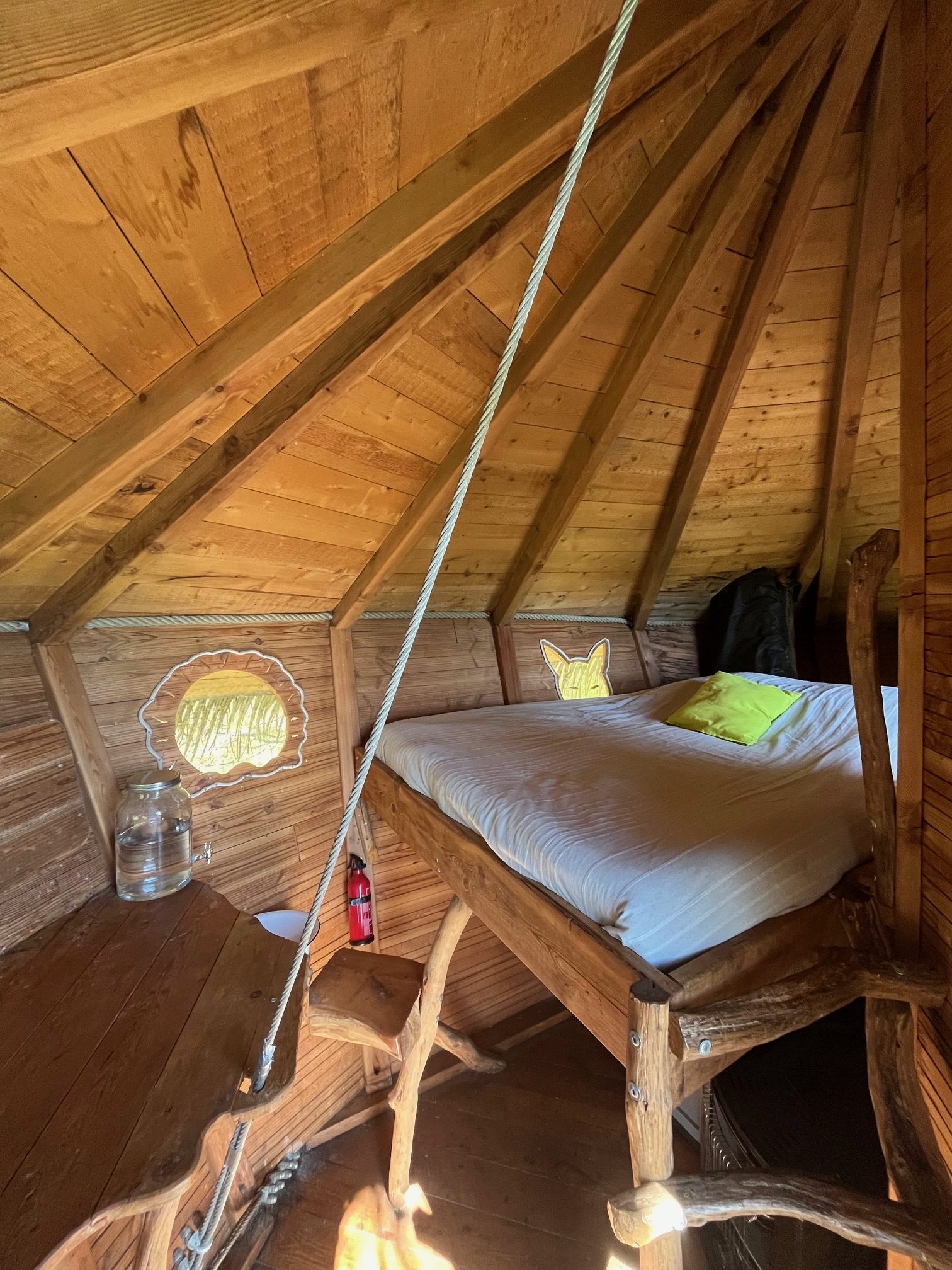 La cabane « Terriers » est un nid douillet situé en lisière de forêt, dans un chêne isolé au dessus de terriers de blaireaux et de renards, orientée plein ouest et bénéficie d’une très belle vue sur les champs. Perchée à 10 mètres du sol, son accès est recommandé aux amateurs de parcours acrobatiques en hauteur puisque il s’agit d’une tyrolienne de 55 mètres qui vous fait glisser jusqu’à une plateforme située sous la cabane, vous prendrez ensuite une échelle suspendue pour y accéder. Une deuxième tyrolienne de 40 m permet de rejoindre la terre ferme. Il est conseillé d’arrivée de jour pour découvrir l’accès. Si vous êtes sujets au vertige s’abstenir !