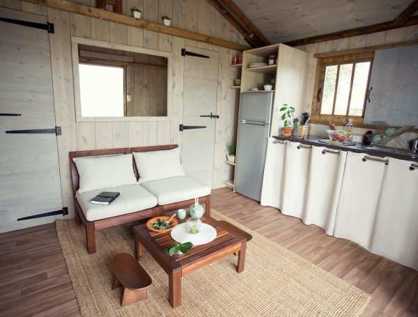 A l’intérieur sur 27m² de plancher bois, vous disposez de 2 chambres avec cloisons et portes en bois. Il y a une chambre avec un lit double 160x200cm et une chambre avec 3 lits simples 80x190cm (dont un accessible par une échelle – pour les enfants à partir de 6 ans
