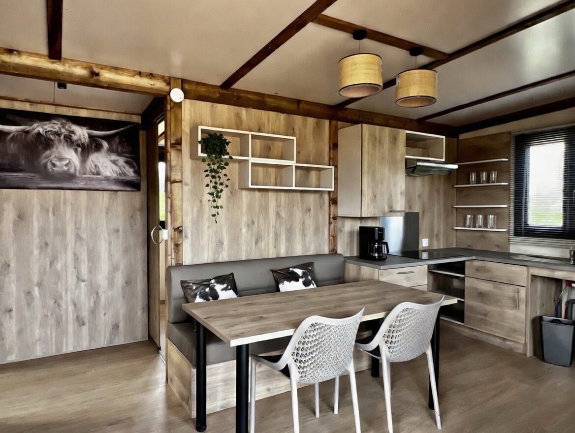 Dès l’arrivée, une immense rampe en bois vous permet une grande facilité d’accès, cette spacieuse cabane est justement conçue pour accueillir confortablement les famille avec des tout-petits, et les personnes à mobilité réduite (équipement adapté et circulation optimisée)