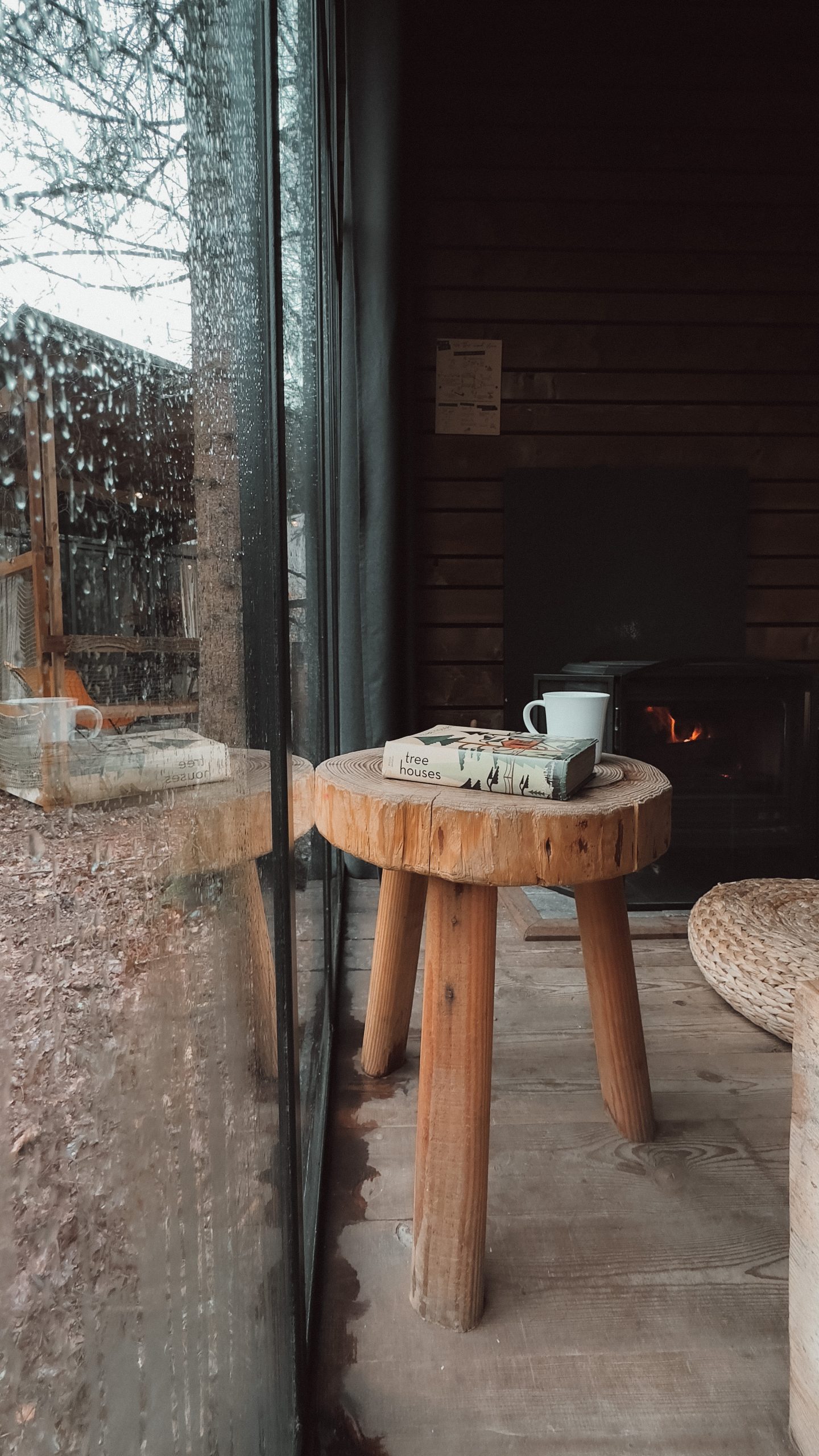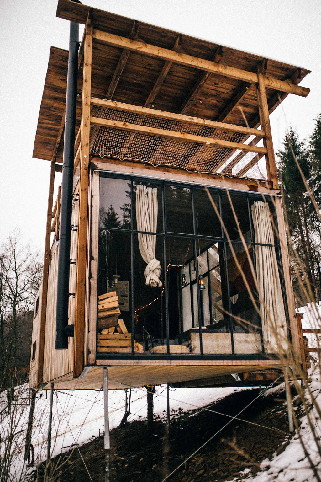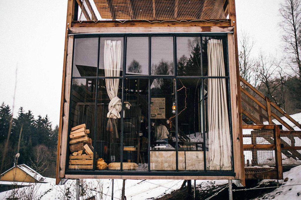 Cabane moderne avec grandes fenêtres, vue sur la nature, ambiance chaleureuse et cosy.