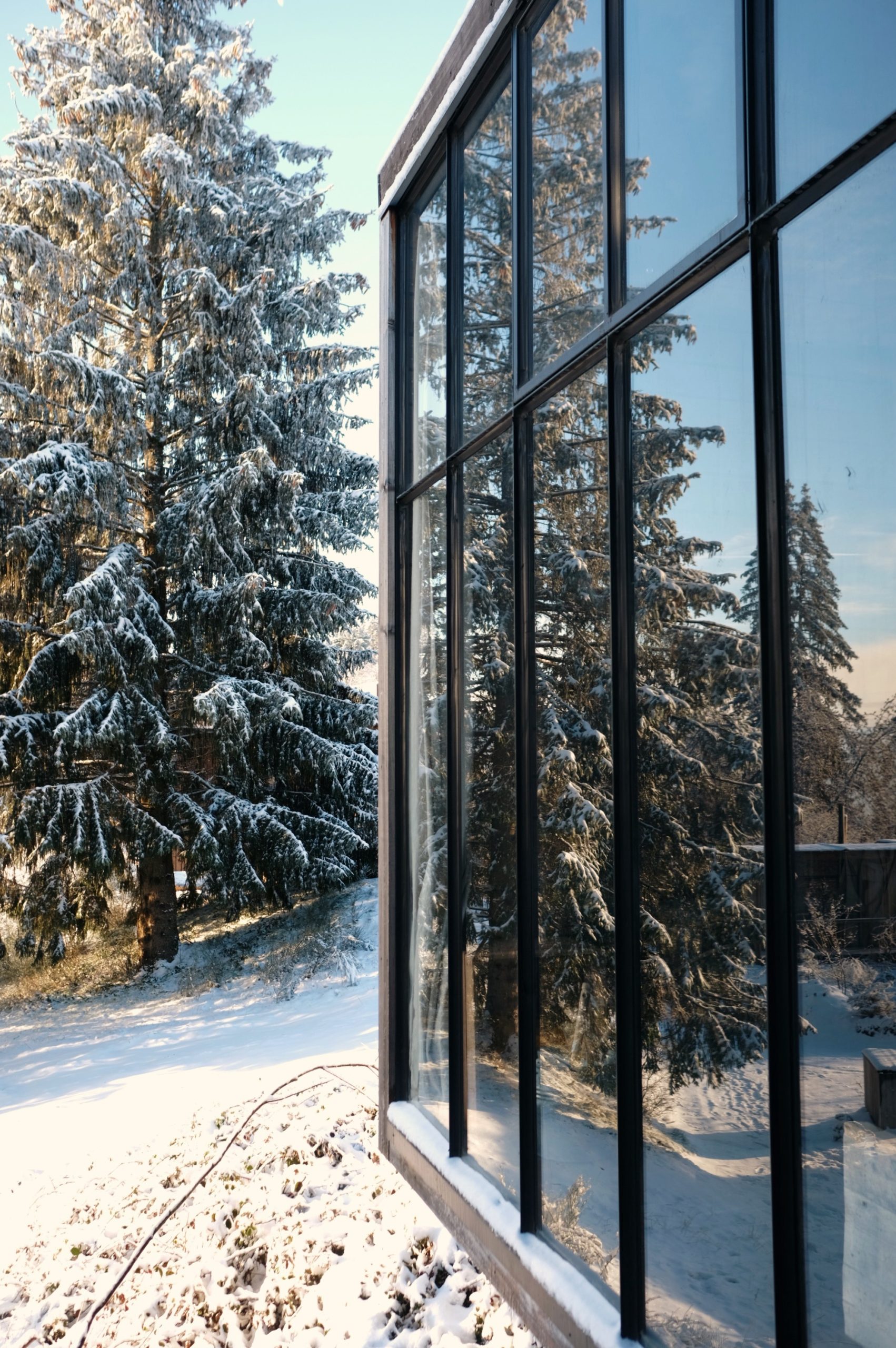 Cabane moderne avec grandes fenêtres, vue sur la nature, ambiance chaleureuse et cosy.