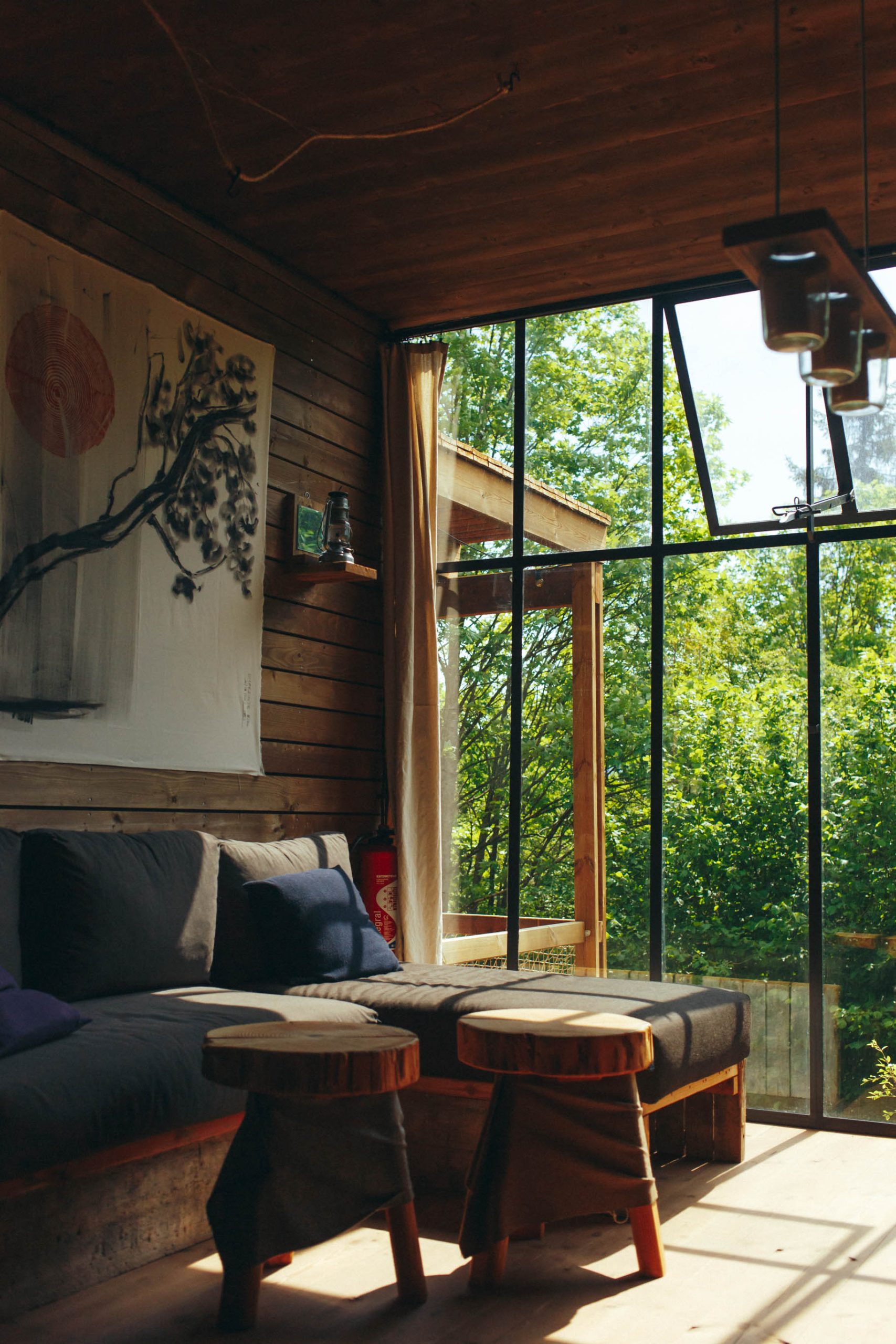 Cabane suspendue dans les arbres, avec de grandes fenêtres offrant une vue sur la forêt.