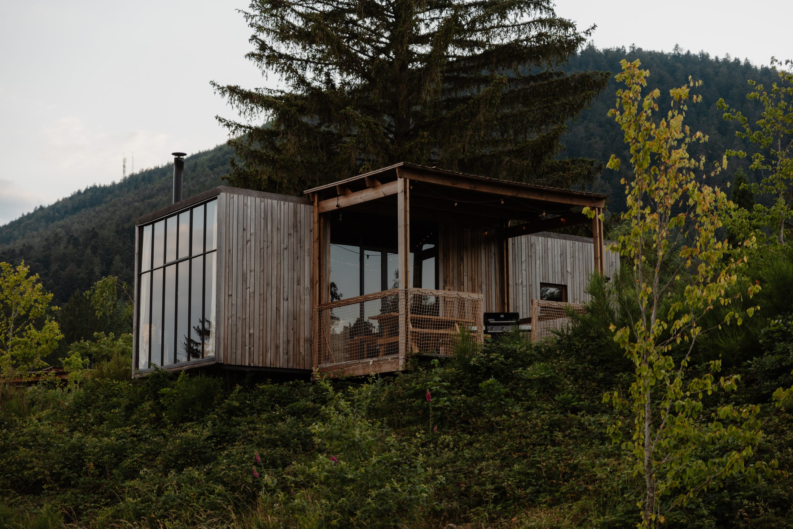 Cabane perchée en bois avec terrasse, éclairage chaleureux et coin barbecue en pleine nature.
