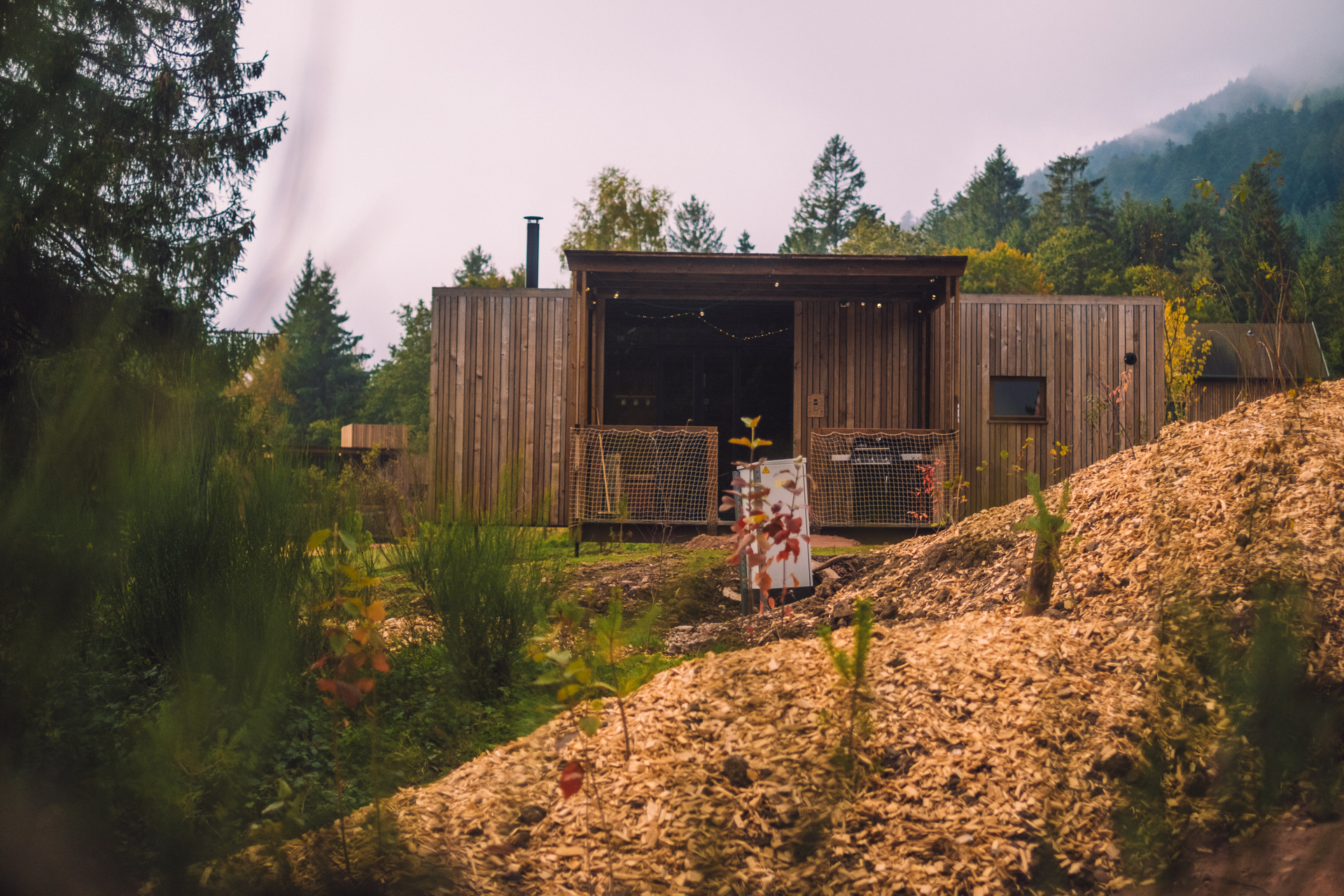 Cabane en bois moderne, entourée de verdure et de copeaux de bois, offrant une vue dégagée.
