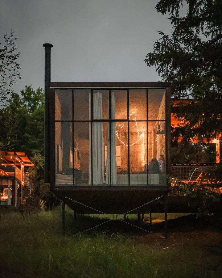 Cabane moderne sur pilotis, illuminée par des guirlandes, entourée de verdure luxuriante.