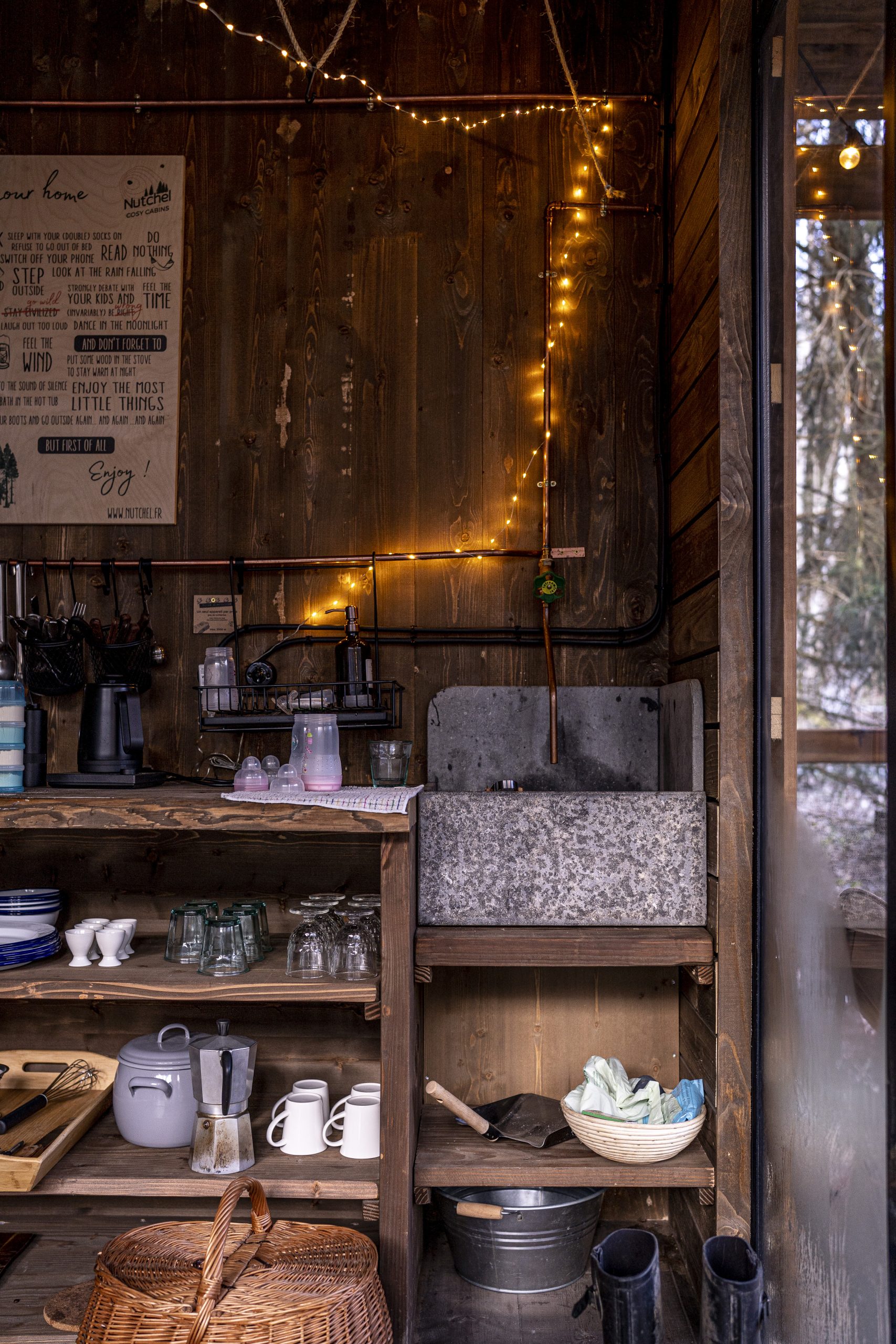 Cabane en bois avec une cuisine rustique, éclairée par des guirlandes lumineuses.