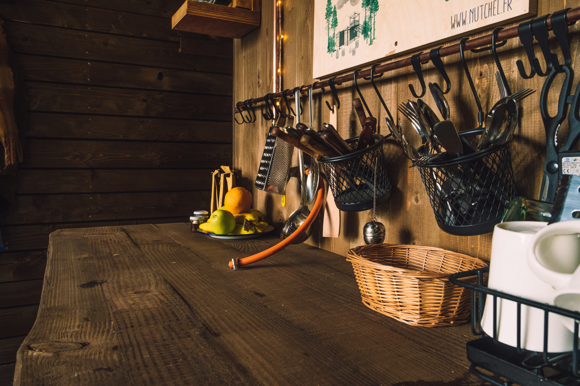Cuisine chaleureuse d'un hébergement insolite, avec bois brut et vaisselle suspendue.