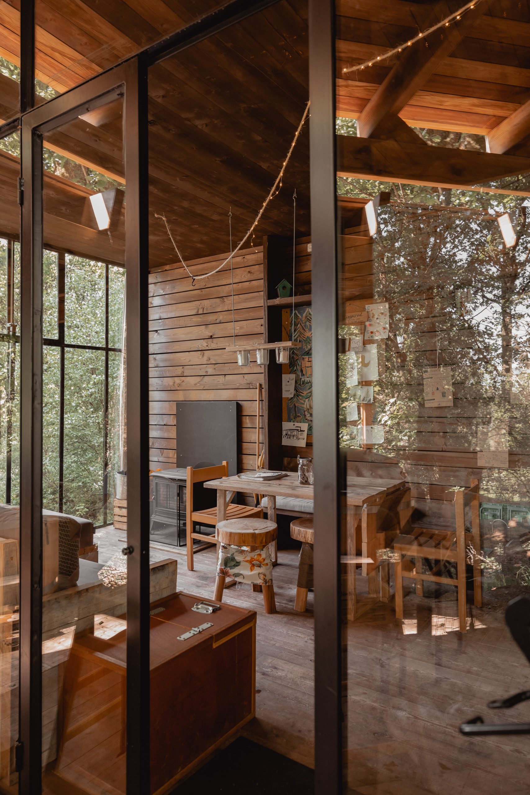 Un chalet en bois avec une table dressée, baigné de lumière naturelle et verdure environnante.
