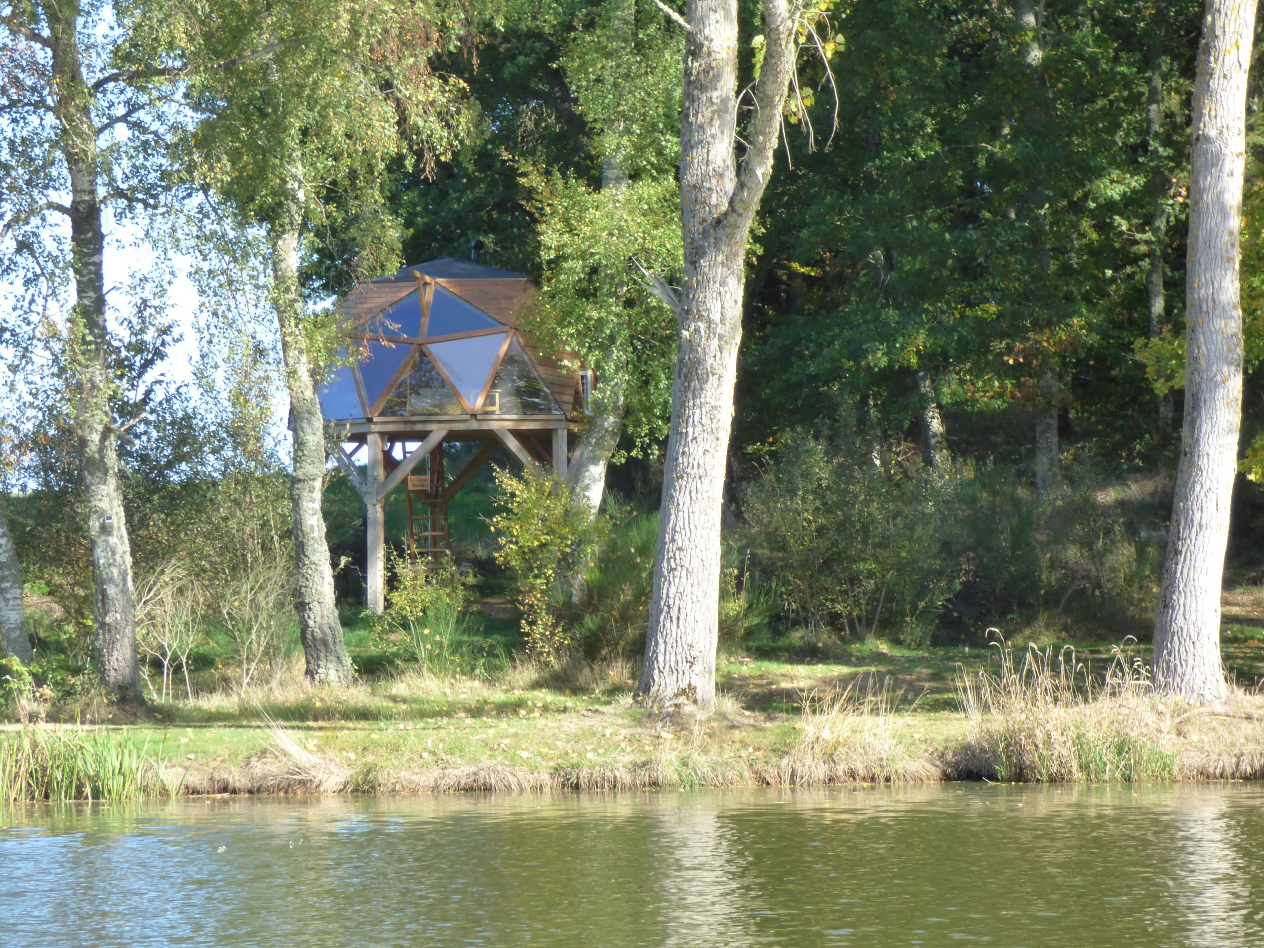 Hébergement insolite en Auvergne, avec vue sur un lac entouré darbres verdoyants.