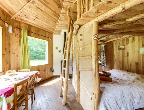 Cette cabane peut accueillir 4 personnes, 1 lit double et deux lits simples en mezzanine (à partir de 6 ans). Toilette sèche à l’arrière de la Cabane et coin cuisine et espace sanitaire à proximité.