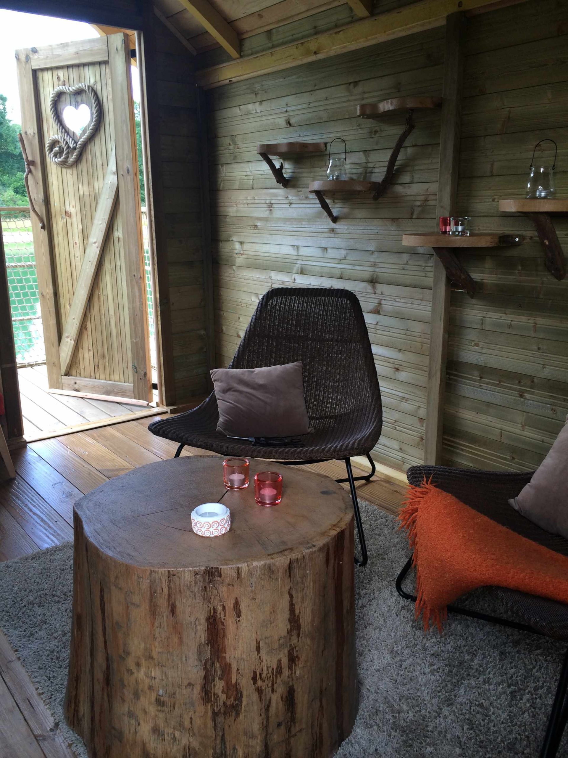 Hébergement insolite en Île-de-France : ambiance cosy avec bougies et décoration en bois.