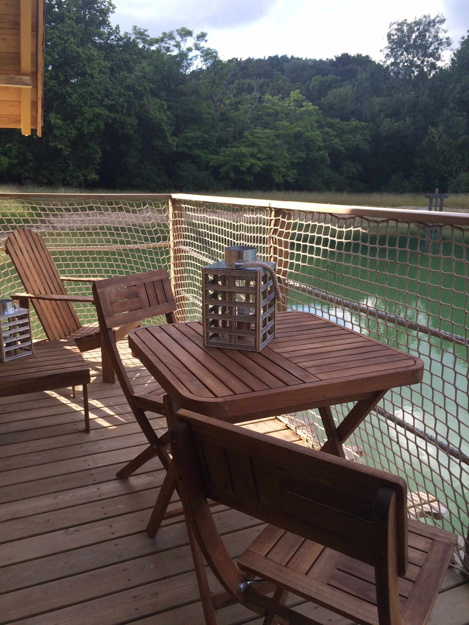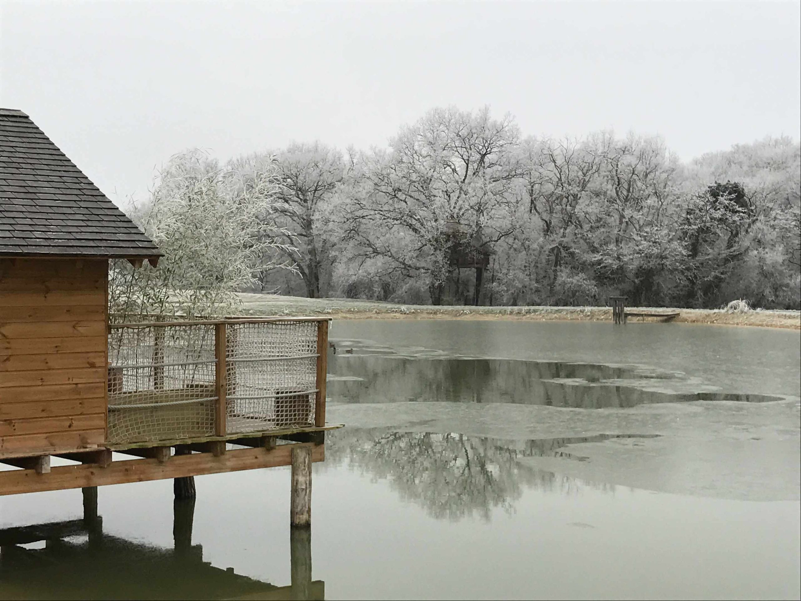 Cabane perchée en Ile-de-France avec vue sur un lac et des arbres dénudés.