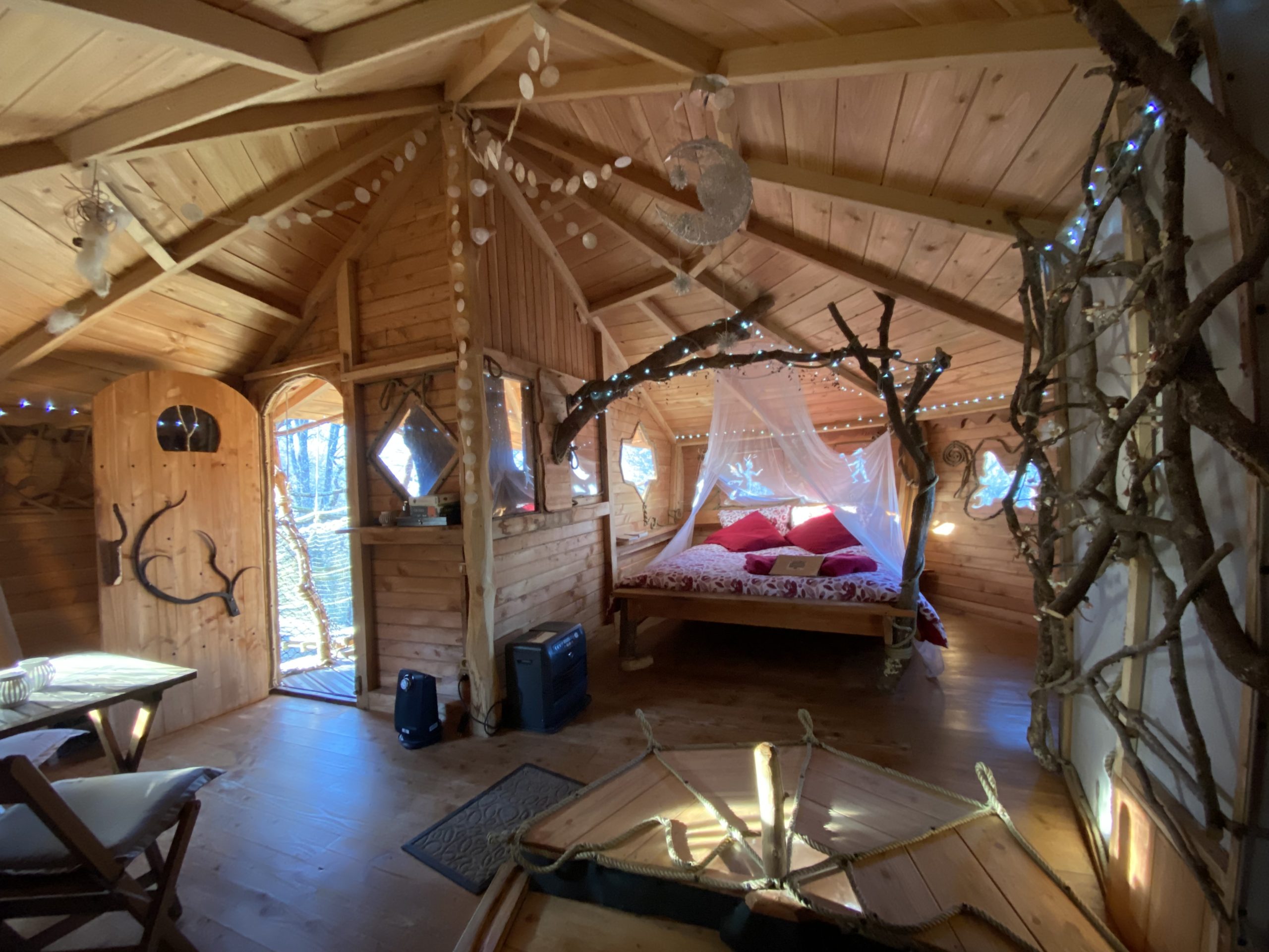 Un escalier en colimaçon vous conduira au cœur de la cabane avec son lit à baldaquin formé par les branches de l’arbre et sa terrasse donnant vue sur les montagnes.