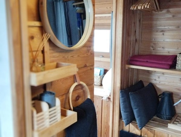 L’intérieur en bois crée une atmosphère chaleureuse et cocooning, idéale pour se détendre.
