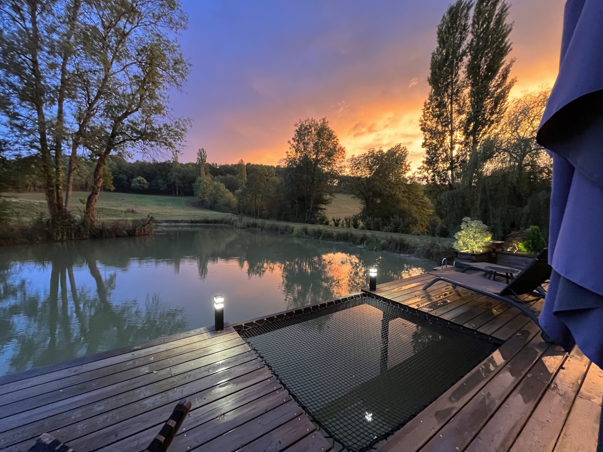 Hébergement insolite en Aquitaine : terrasse avec vue sur le lac, petit-déjeuner gourmand.