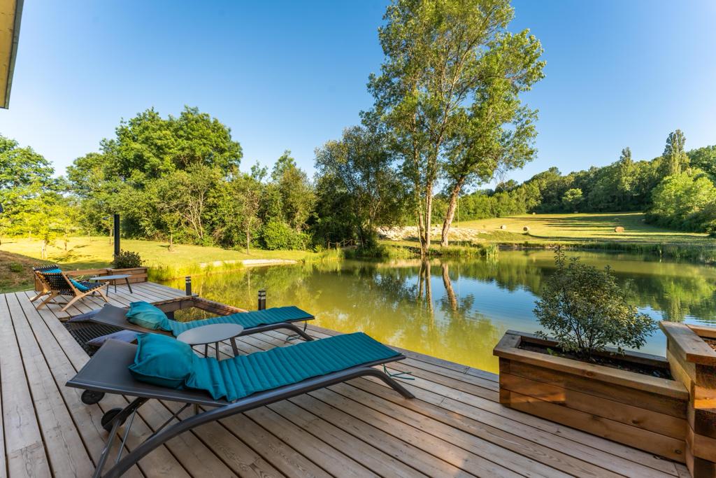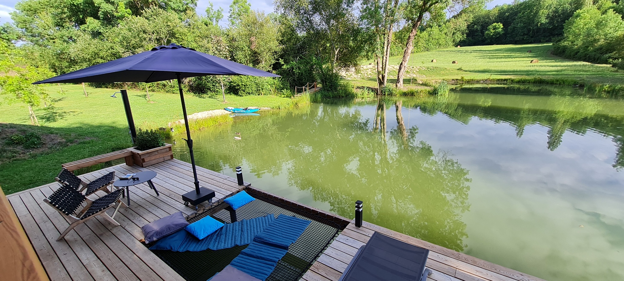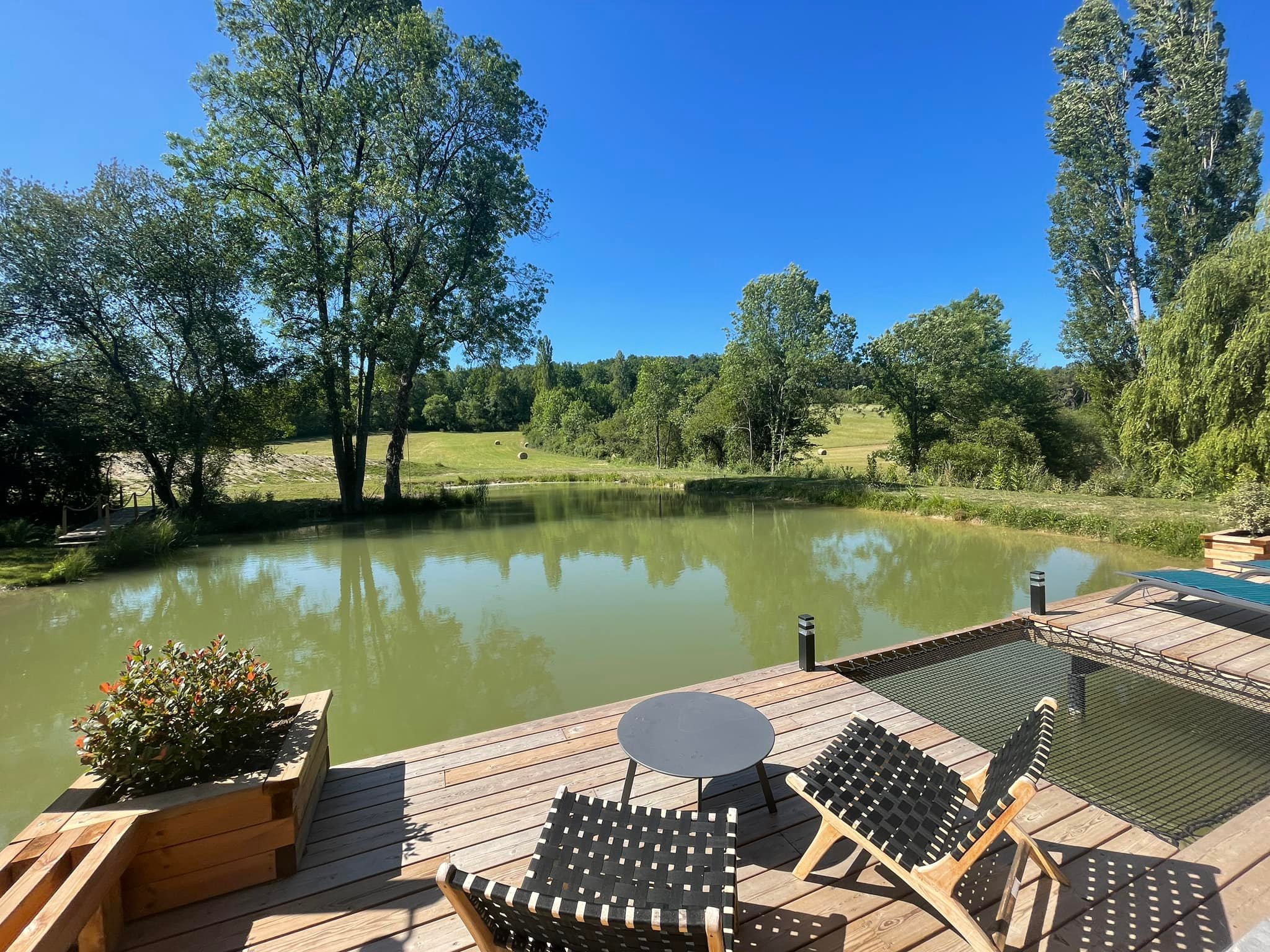 Hébergement insolite en Aquitaine, avec terrasse surplombant un lac verdoyant.