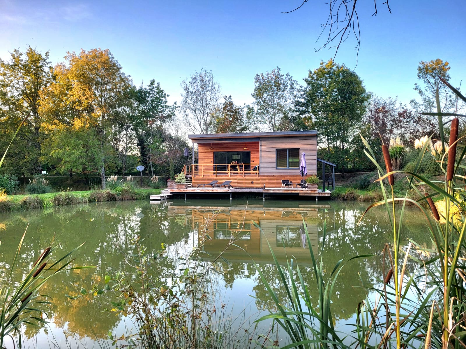 Chalet flottant en Aquitaine avec vue sur un lac scintillant et verdoyant.