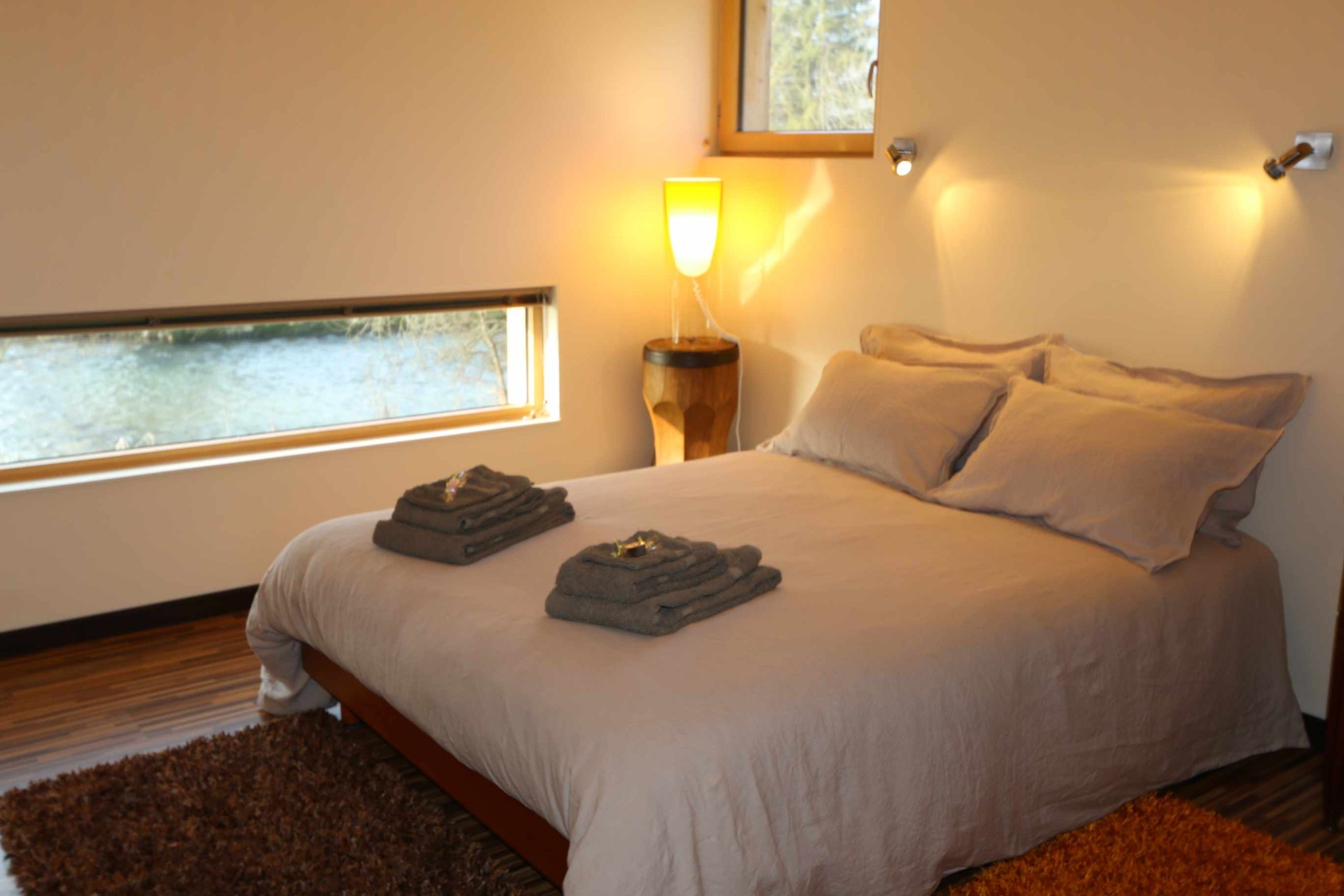 Contempler le réveil de la nature depuis votre lit, les reflets de la lune sur la rivière… Une fenêtre “d’observation” a été pensée et intégrée.