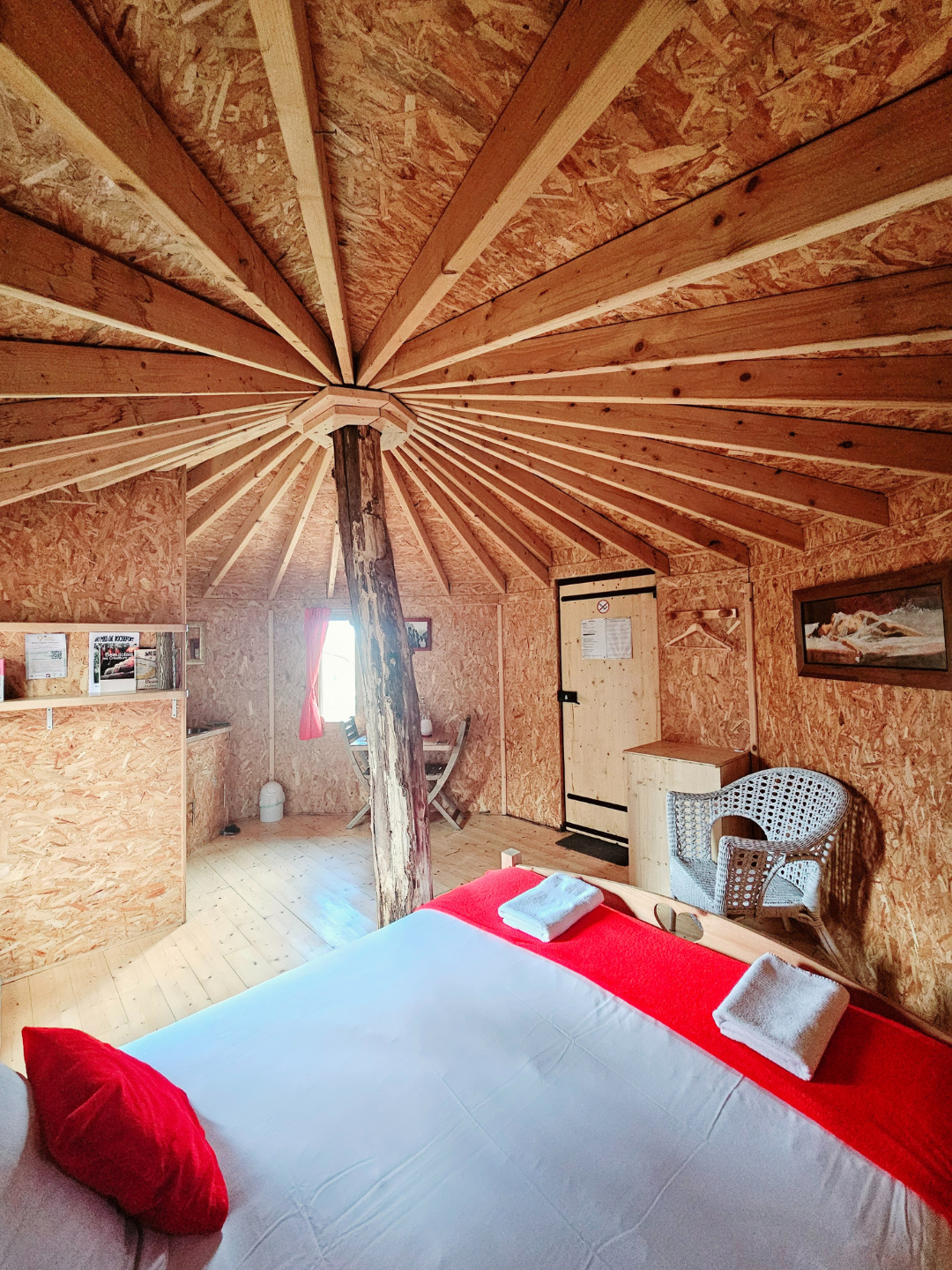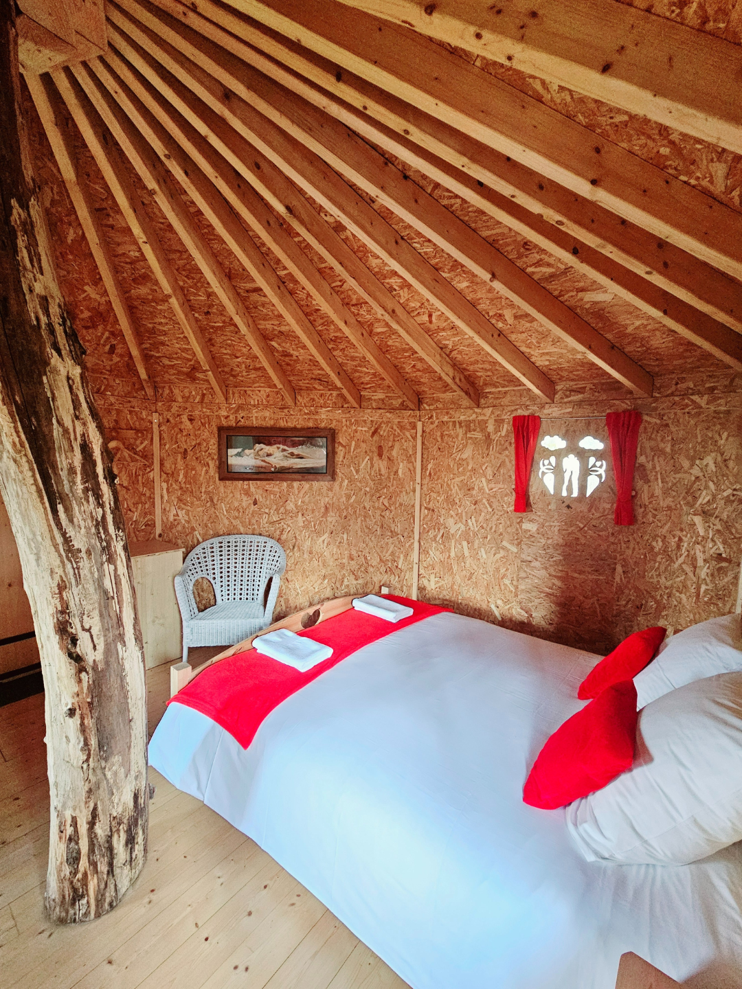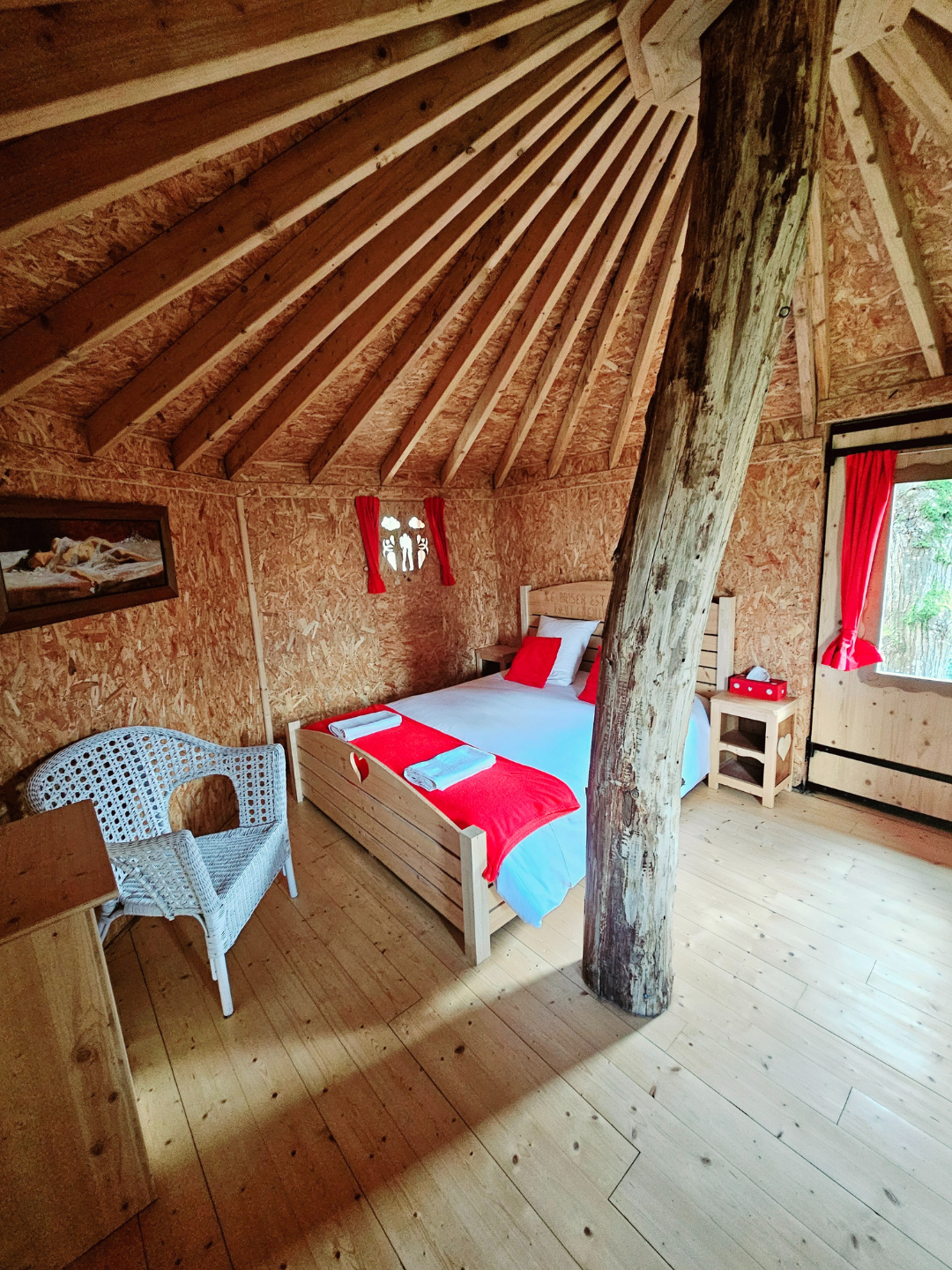 Cette cabane cosy allie confort et dépaysement : lit moelleux, décoration chaleureuse aux accents romantiques et terrasse suspendue pour profiter pleinement du panorama forestier. Ici, la nature devient votre décor, entre calme et atmosphère intimiste.