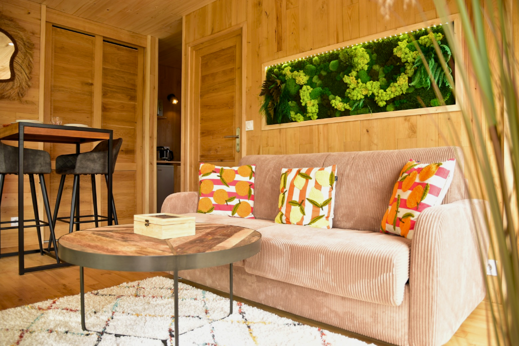 Hébergement insolite en Bretagne : chalet en bois avec poutres apparentes et mobilier design.