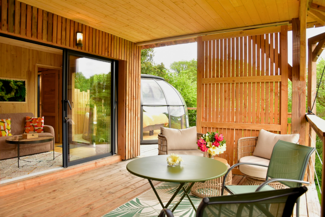 Hébergement insolite en Bretagne : cabane en bois avec terrasse et mobilier moderne.