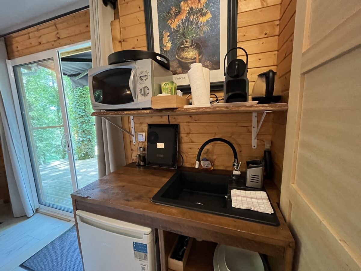 Hébergement insolite avec jacuzzi, entouré de verdure et de bois, offrant une ambiance relaxante.