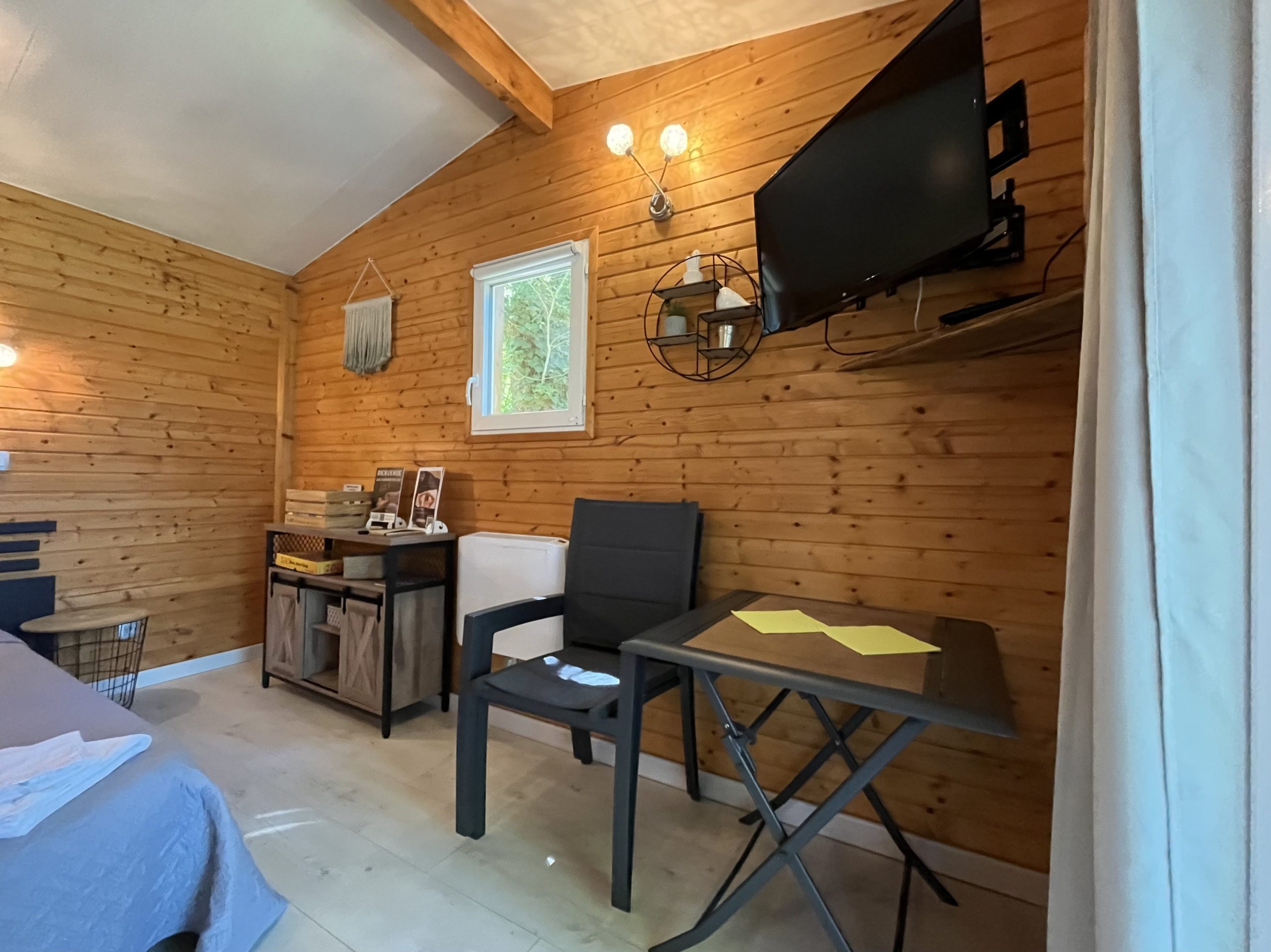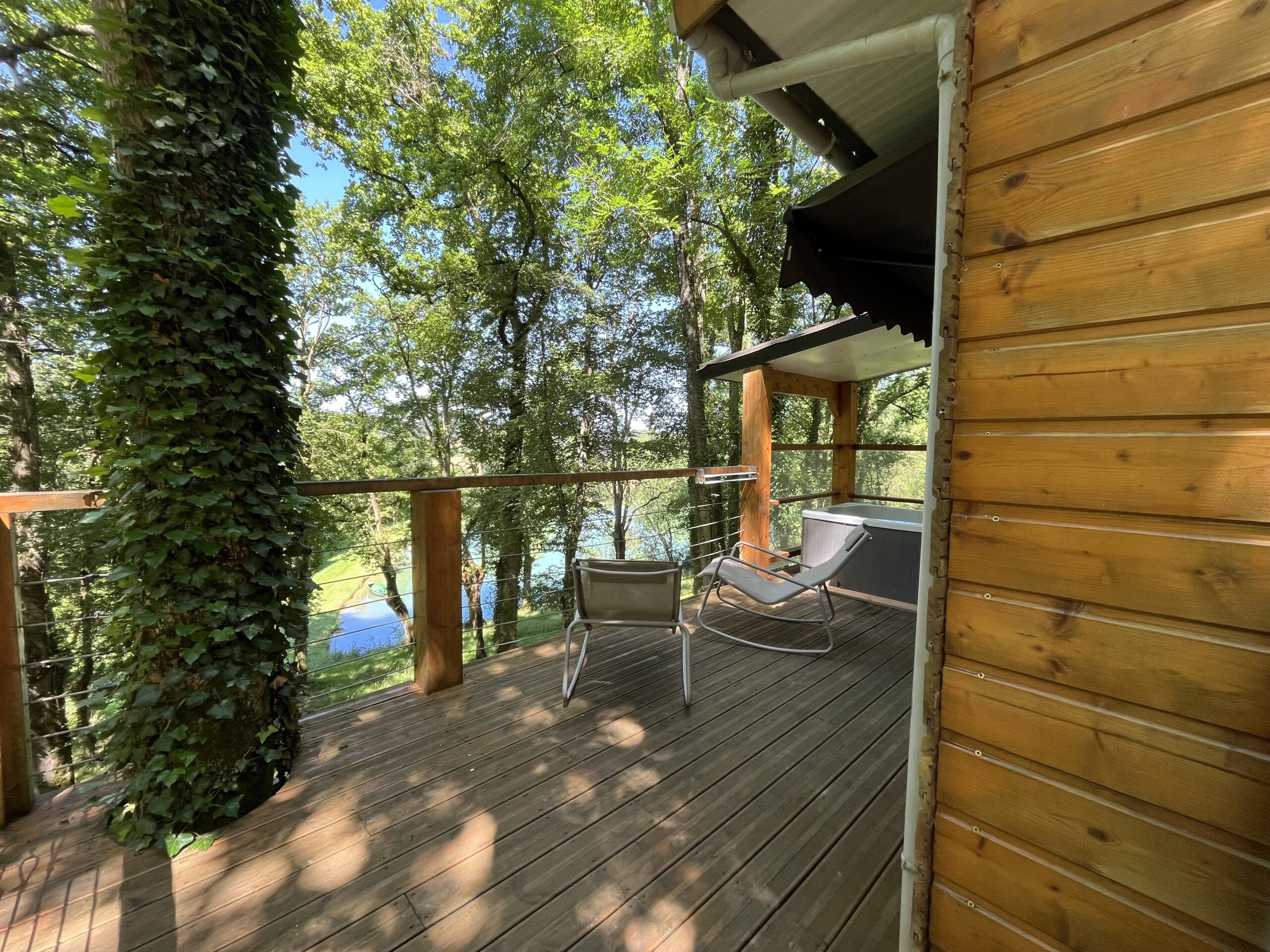 Hébergement insolite : chalet en bois avec terrasse, jacuzzi et vue sur la nature verdoyante.