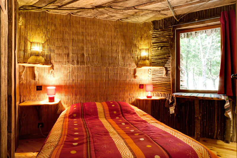 Cabanes en bois à Nouvelle-Aquitaine, avec lits en bois sculpté et ambiance chaleureuse.