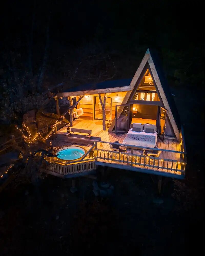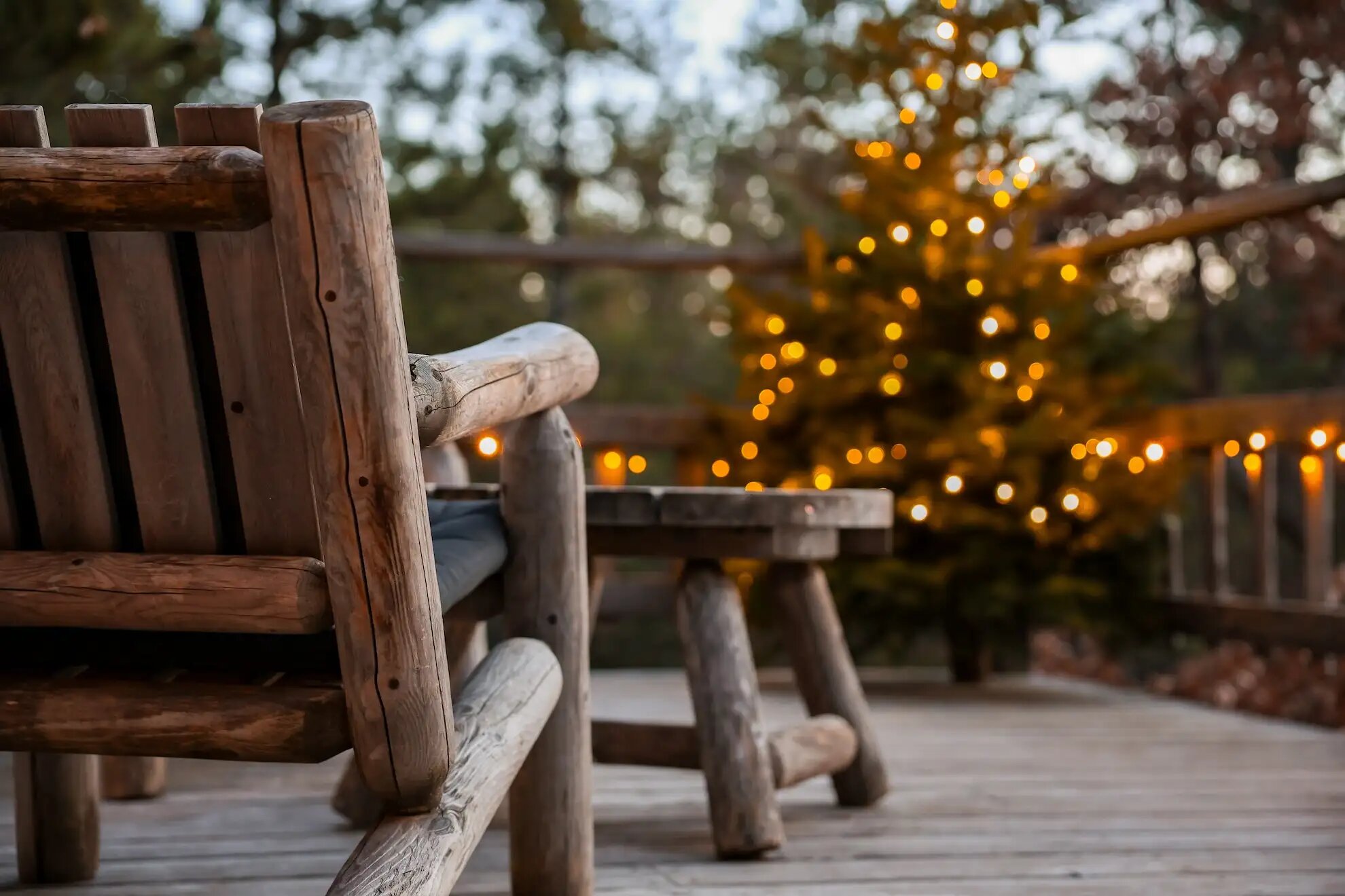 L’expérience atteint son apogée sur la terrasse éclairée de guirlandes, où vous attend votre jacuzzi privatif, niché au pied d’un chêne centenaire :