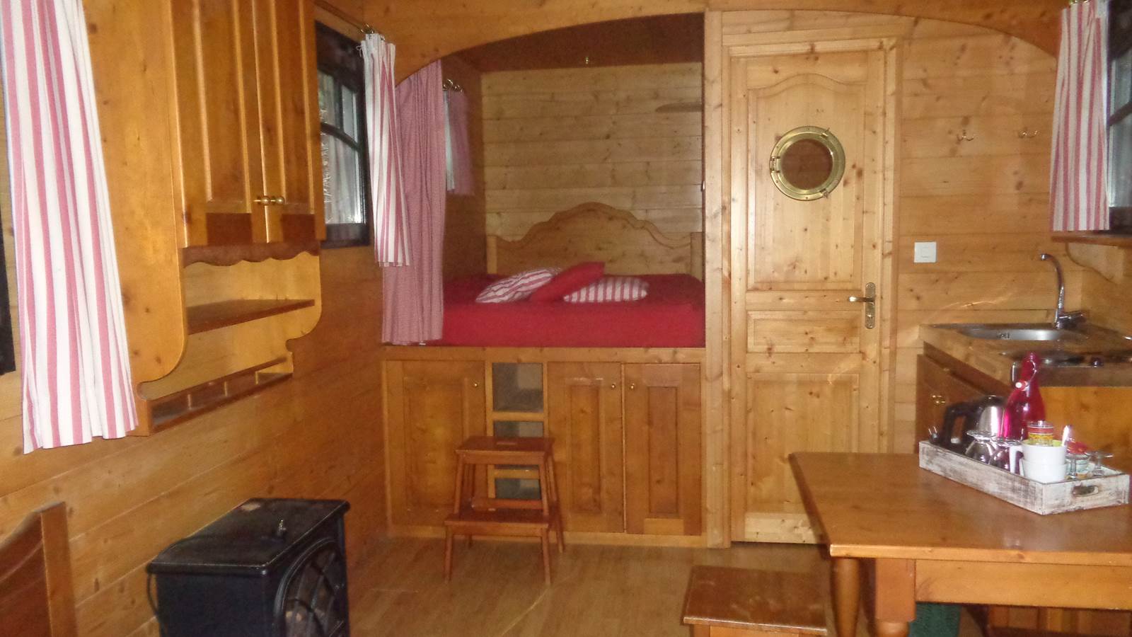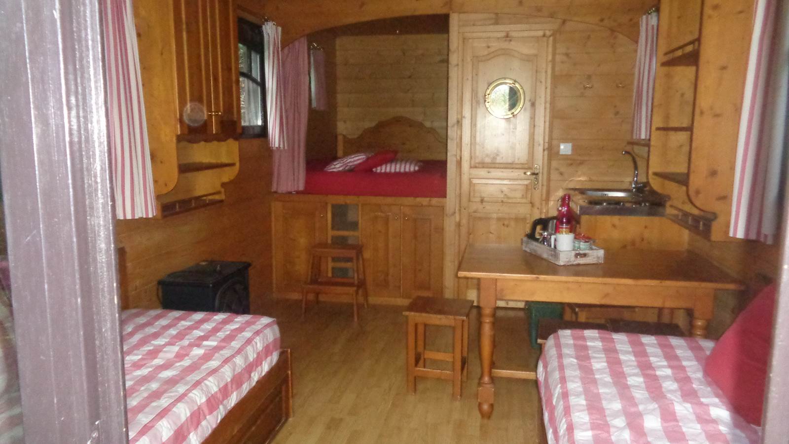 Installée dans un parc arboré, à 50 mètres de la maison, la roulotte « Campagne et Bois » vous séduira par son charme et son confort. Entièrement aménagée en bois, elle offre un vaste espace de vie avec un coin cuisine équipé (réfrigérateur, plaques électriques, bouilloire, cafetière, table, chaises et vaisselle), un lit en 140 fermé par un rideau, ainsi qu’un ensemble de deux canapés convertibles en lits de 90.