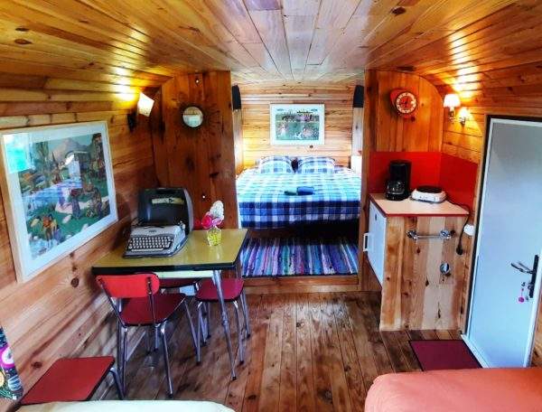 La “Roulotte Vintage” est constituée d’une chambre et d’un séjour avec kitchenette. Pour passer un week-end en famille ou en amoureux, cet hébergement accueille un lit double 160 cm x 200 cm dans la chambre, il peut aussi être séparé en deux. Dans le séjour, les banquette peuvent devenir deux lits individuels ou un lit double. Pour préparer vos repas, le coin cuisine est équipé d’un réfrigérateur et d’une plaque de cuisson.