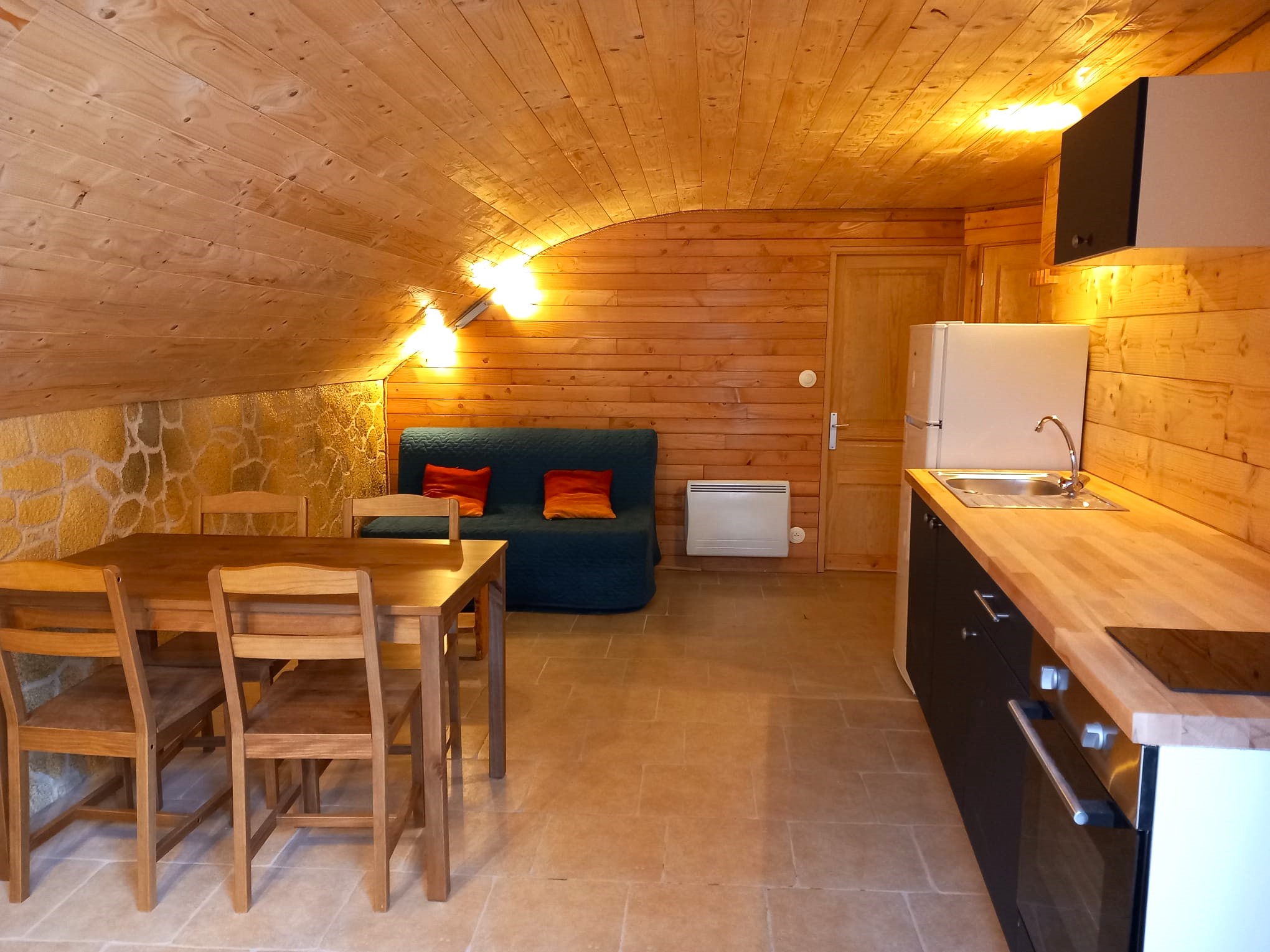 Chalet en bois à Auvergne, intérieur lumineux avec cuisine moderne et table en bois.