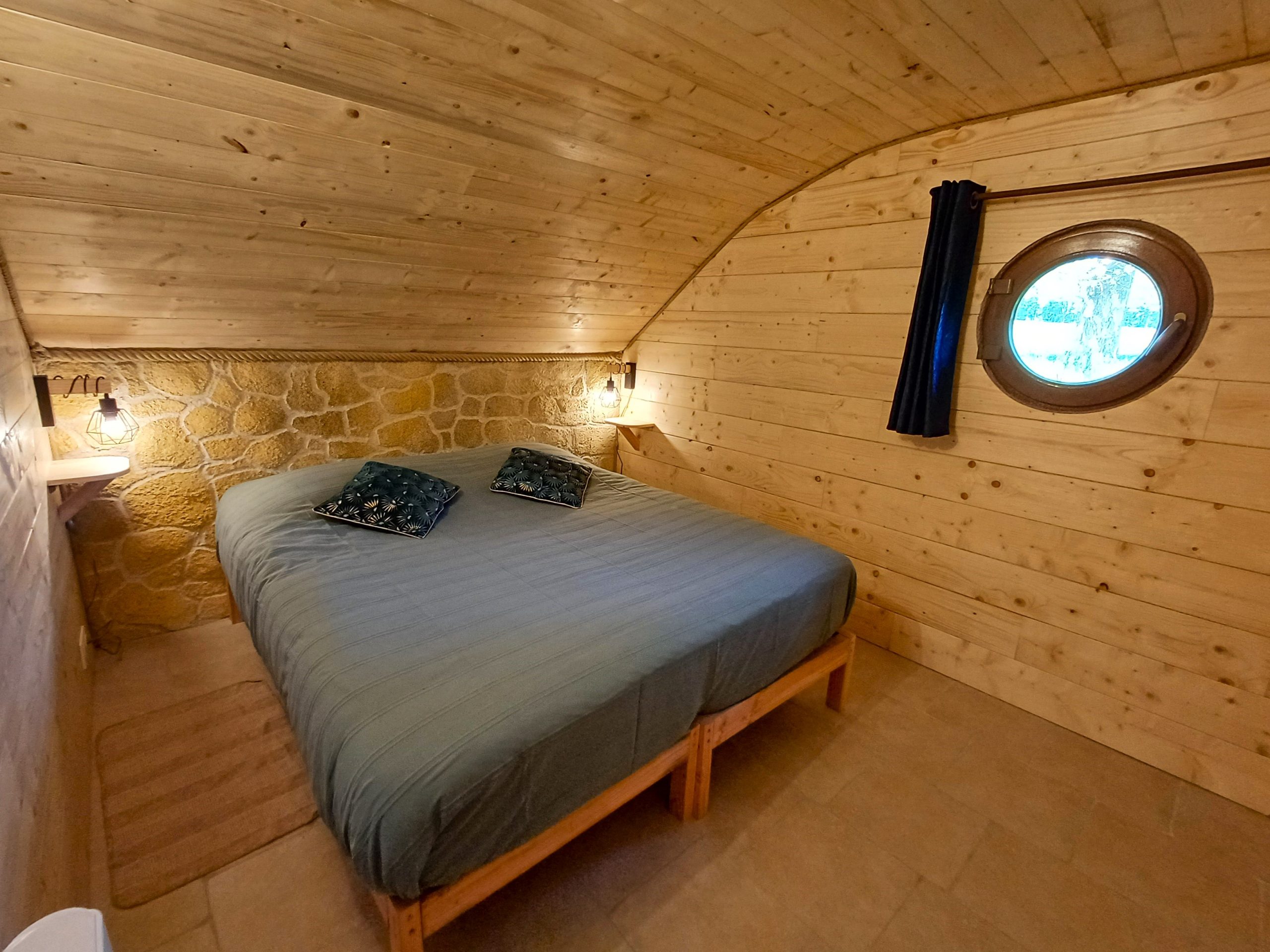 Hébergement insolite en Auvergne : cabane avec lit en bois et fenêtres rondes.