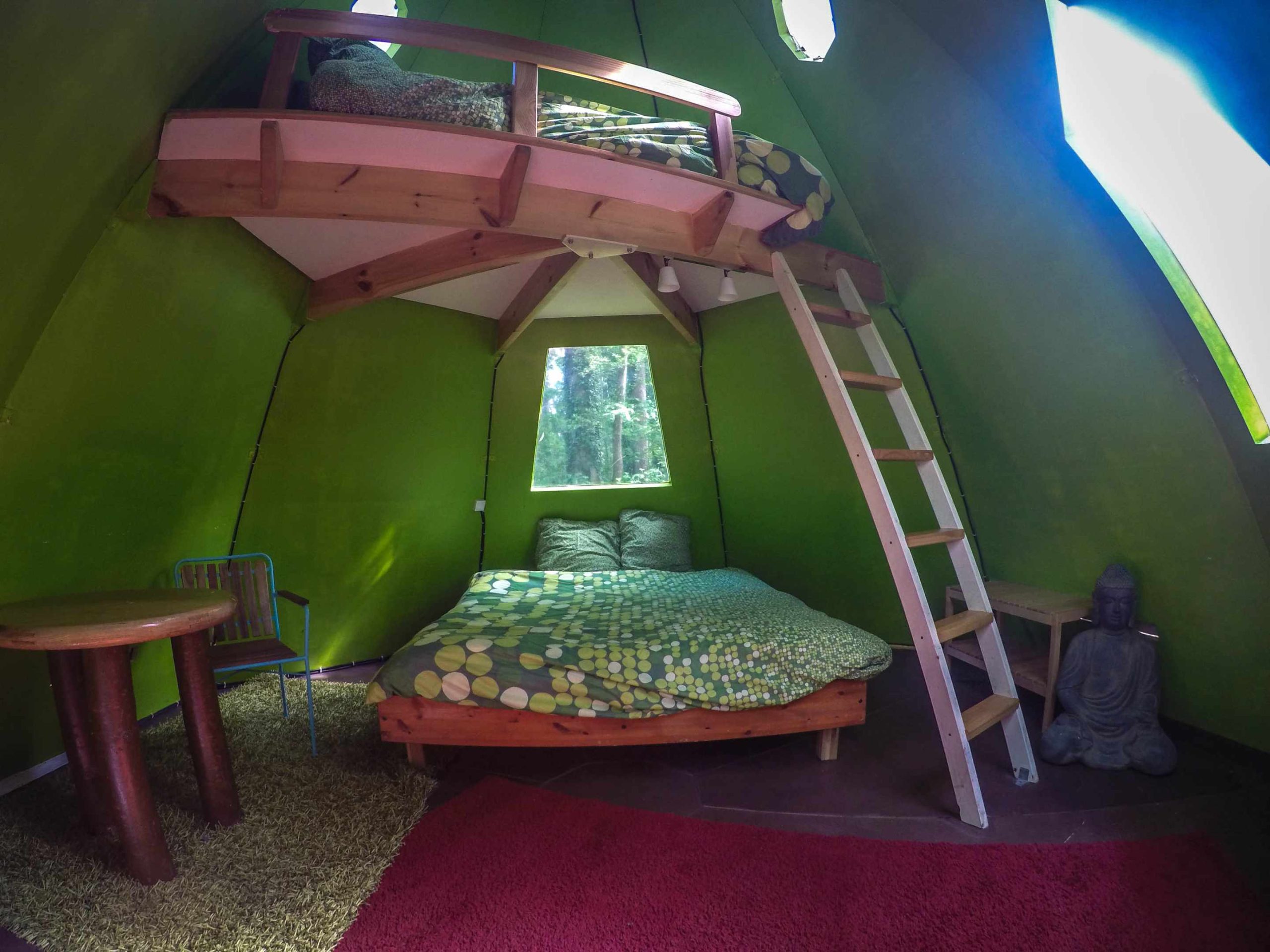 Hébergement insolite : bulle suspendue avec un lit douillet, entourée de verdure.