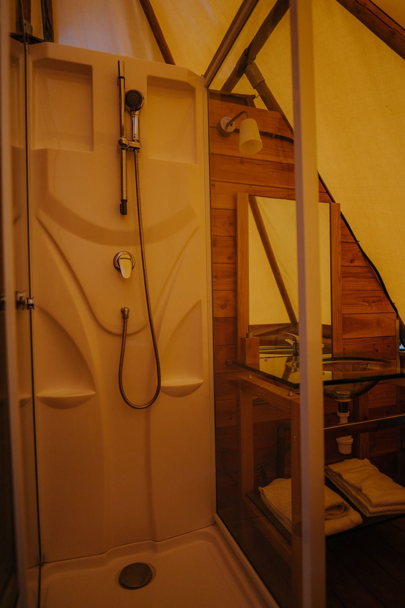 Disposant d’un grand espace habitable, les tipis sont emménagés d’une cuisine et d’un coin salle de bain. Vous pourrez profiter de son coin jardin pour vous réunir à toute heure, avec à votre disposition, un barbecue.